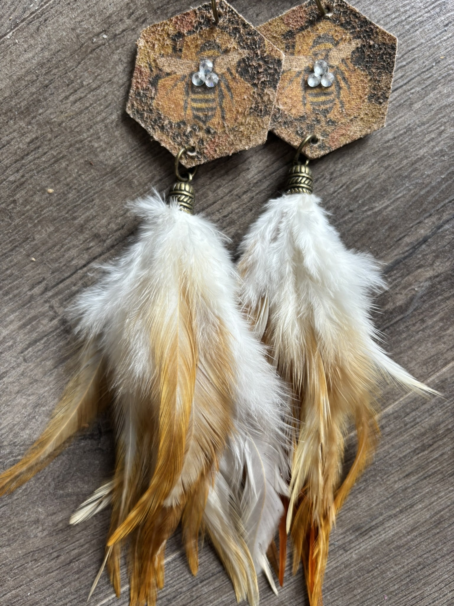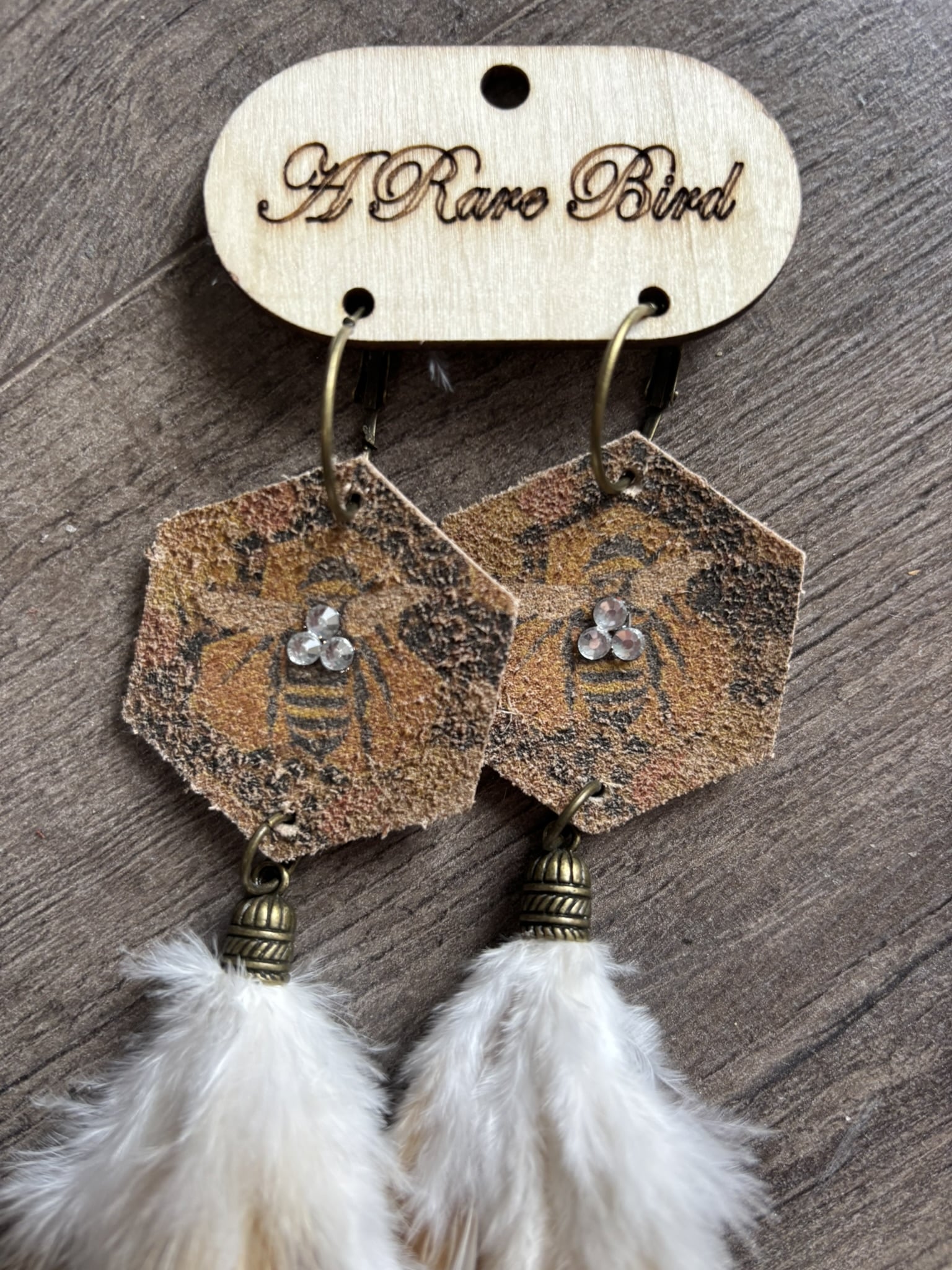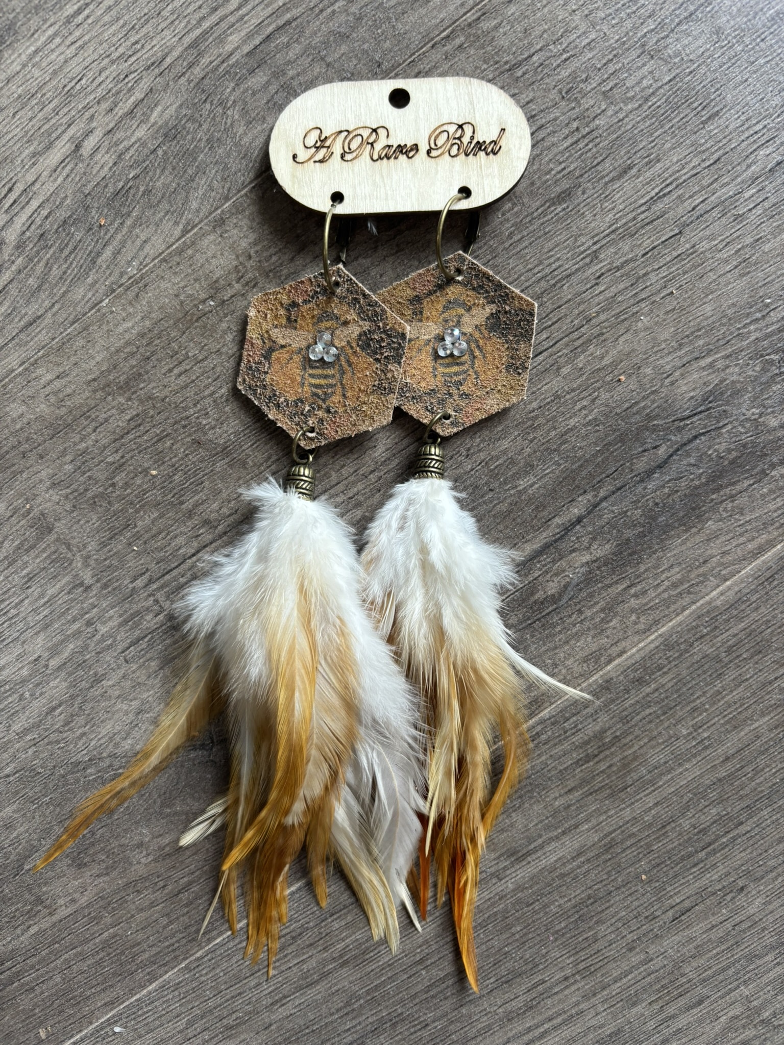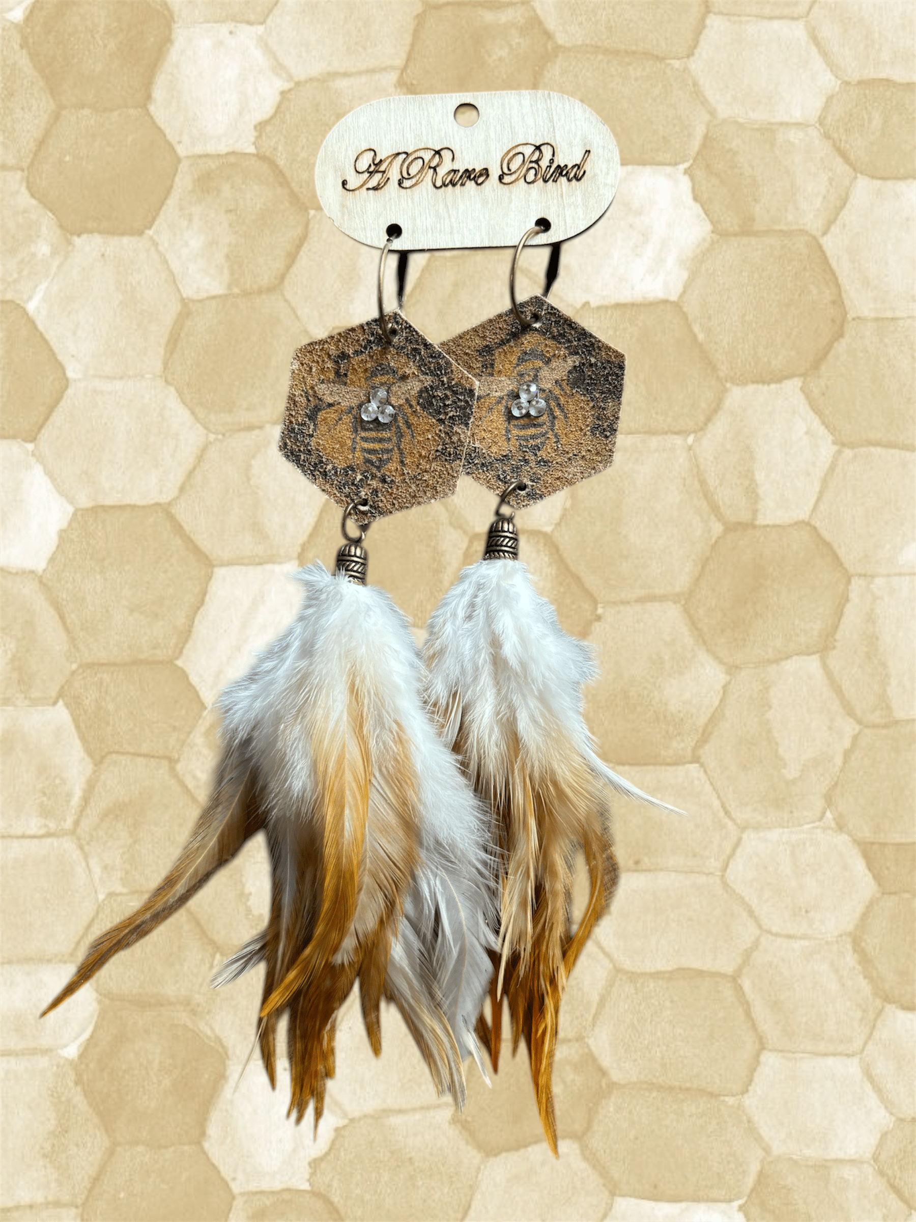Lightweight statement earrings featuring a bee and honeycomb design printed on genuine leather, finished with soft feather drops for a free spirited, earthy feel. Matching necklace available!