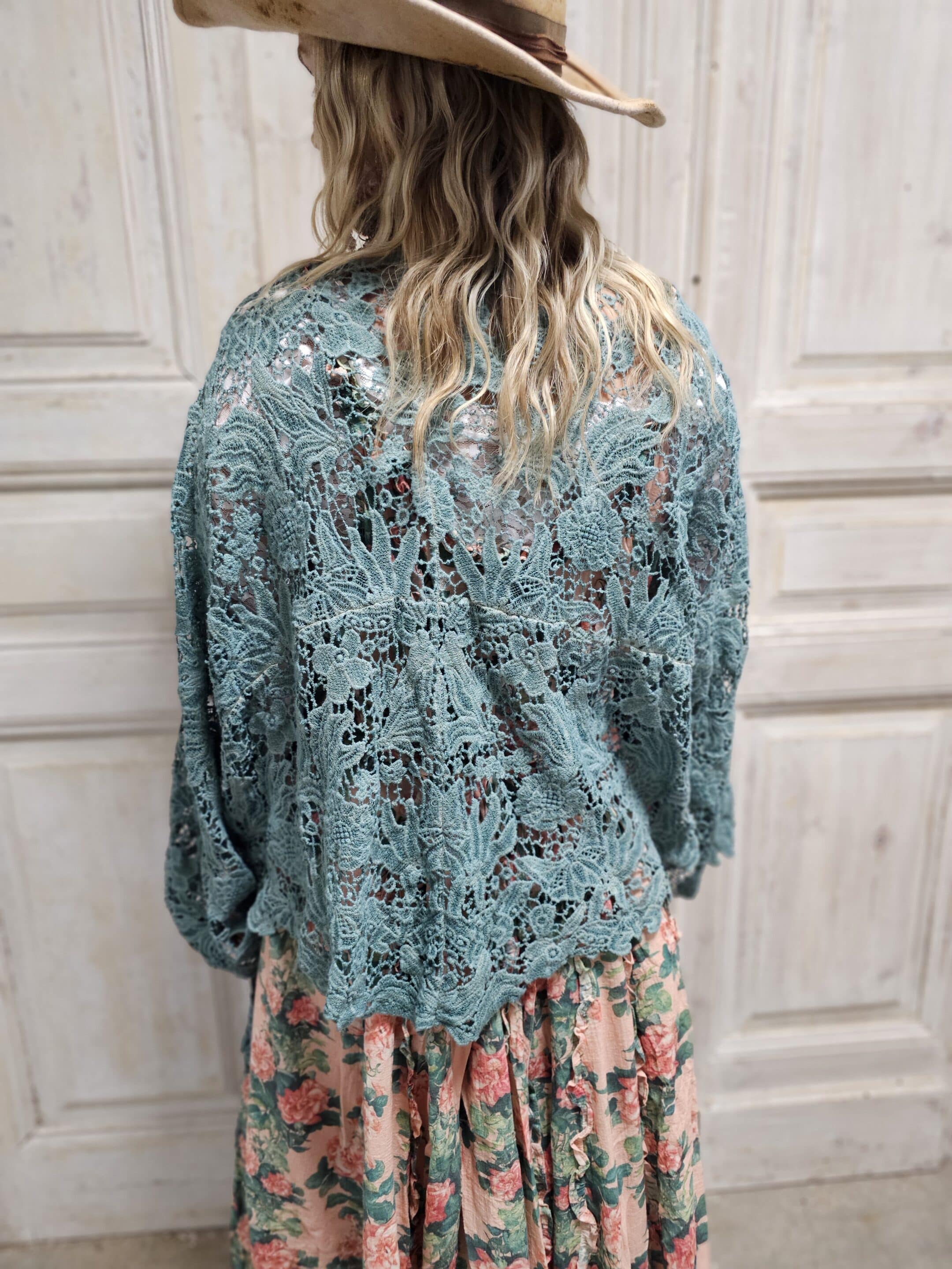 Gorgeous deep turquoise crochet throwover with intricate flowers and butterflies all over. Relaxed oversized fit with long pieces on the front for the option of tying. One Size and can be dressed up or worn over leggings/jeans to elevate a simple outfit!