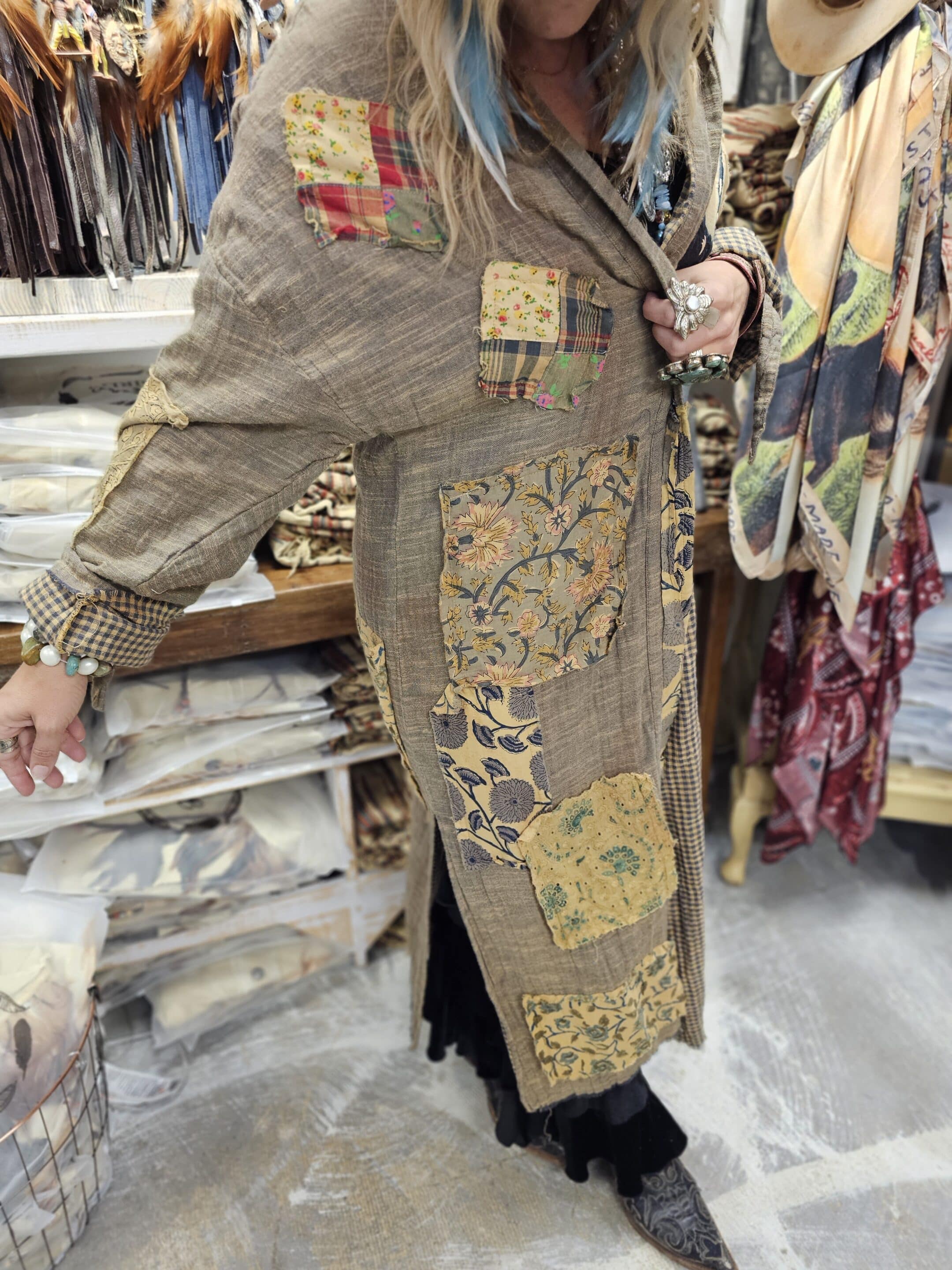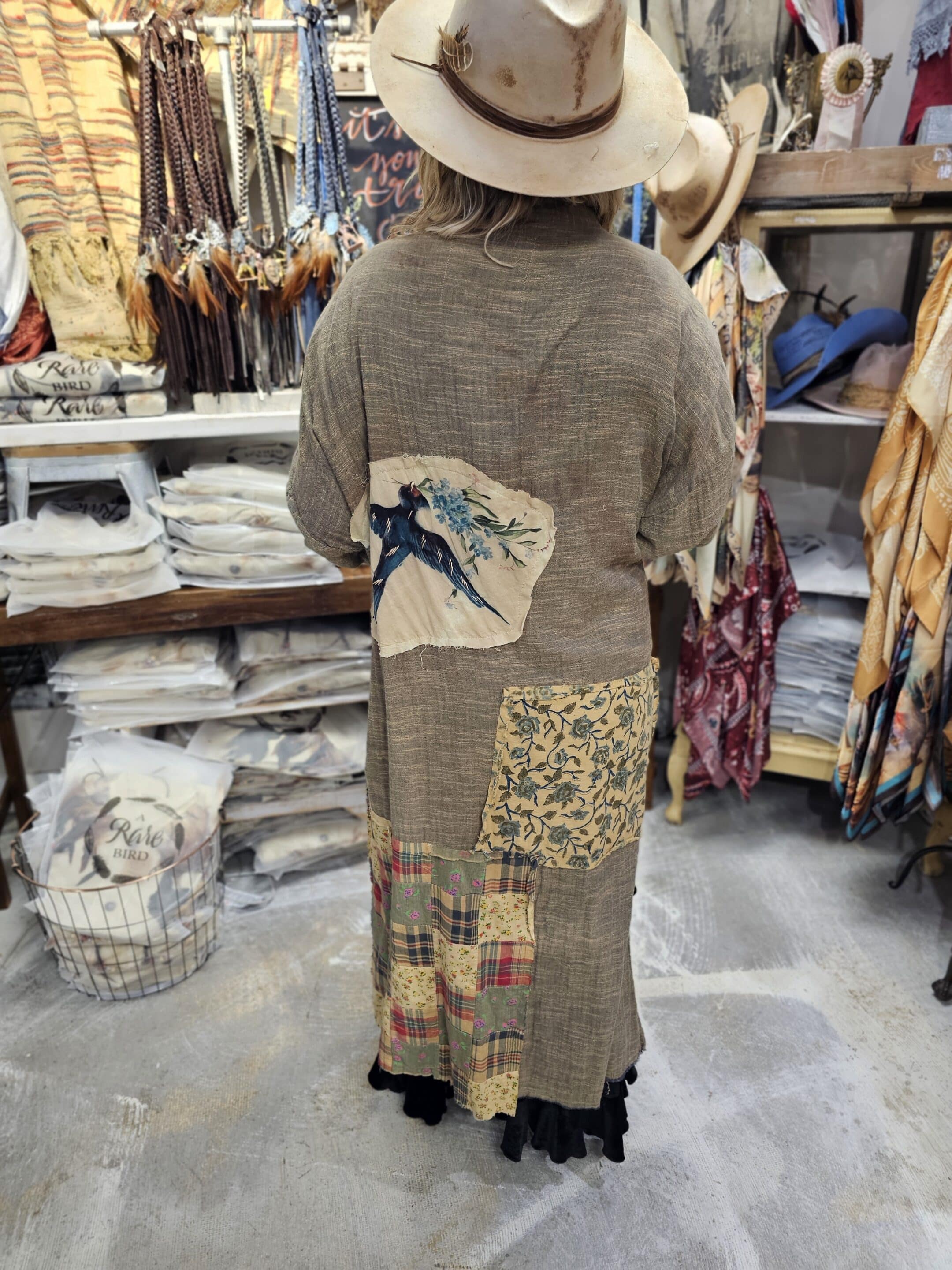 A Rare Bird treasure you don’t want to miss–this One size duster is made of soft, distressed lined cotton and brought to life with playful- hand stitched patches and roomy pockets. On the back, a striking starling bird takes flight, making this piece as artistic as it is wearable. Wrap up in this cozy piece that tells and feels like a story from the past…completely loveable just like you!