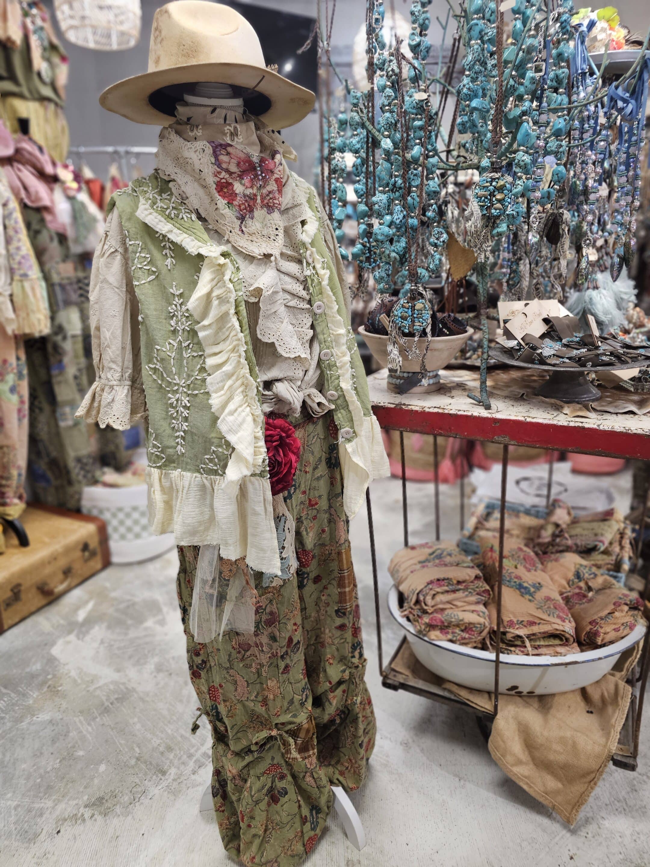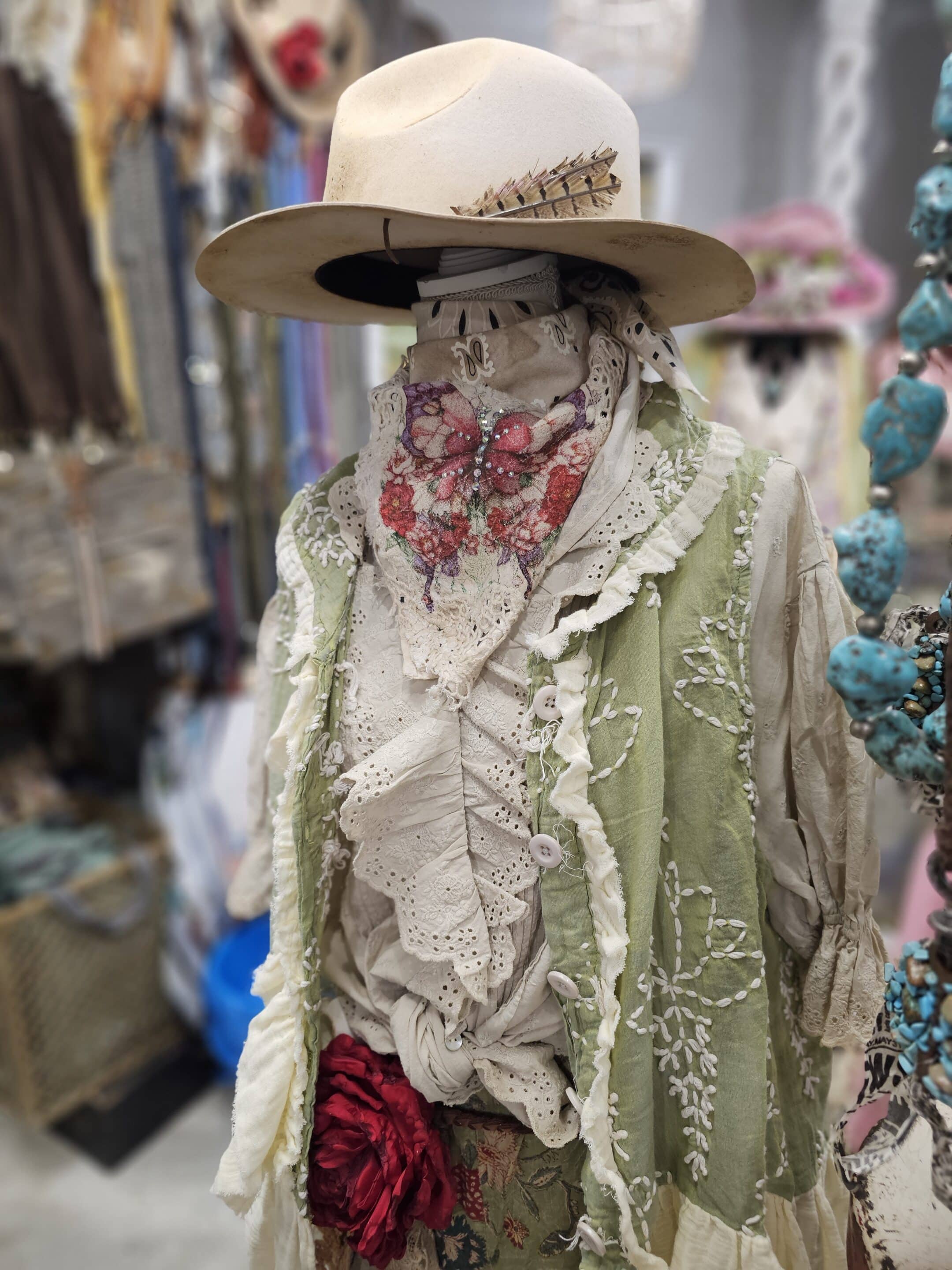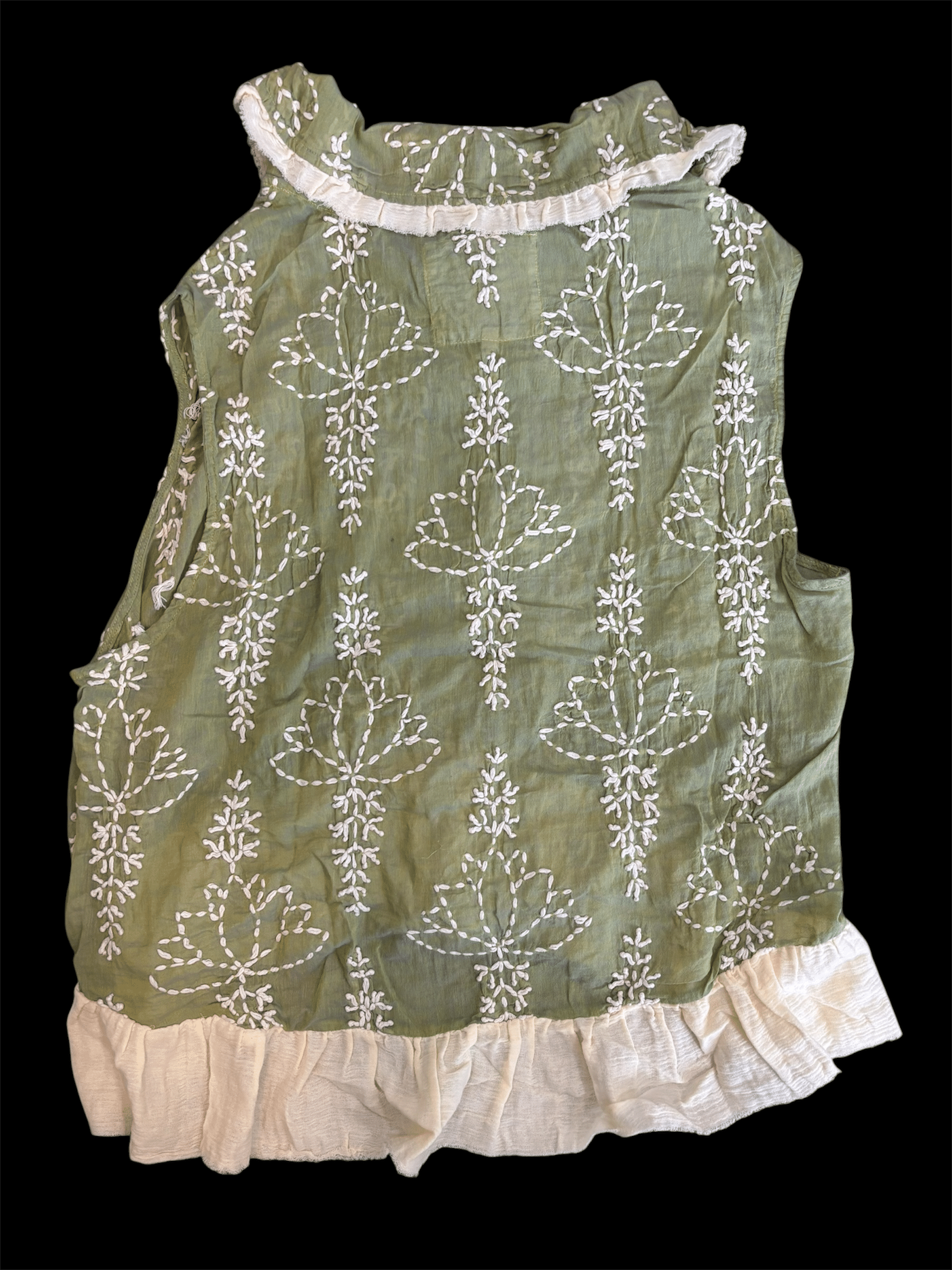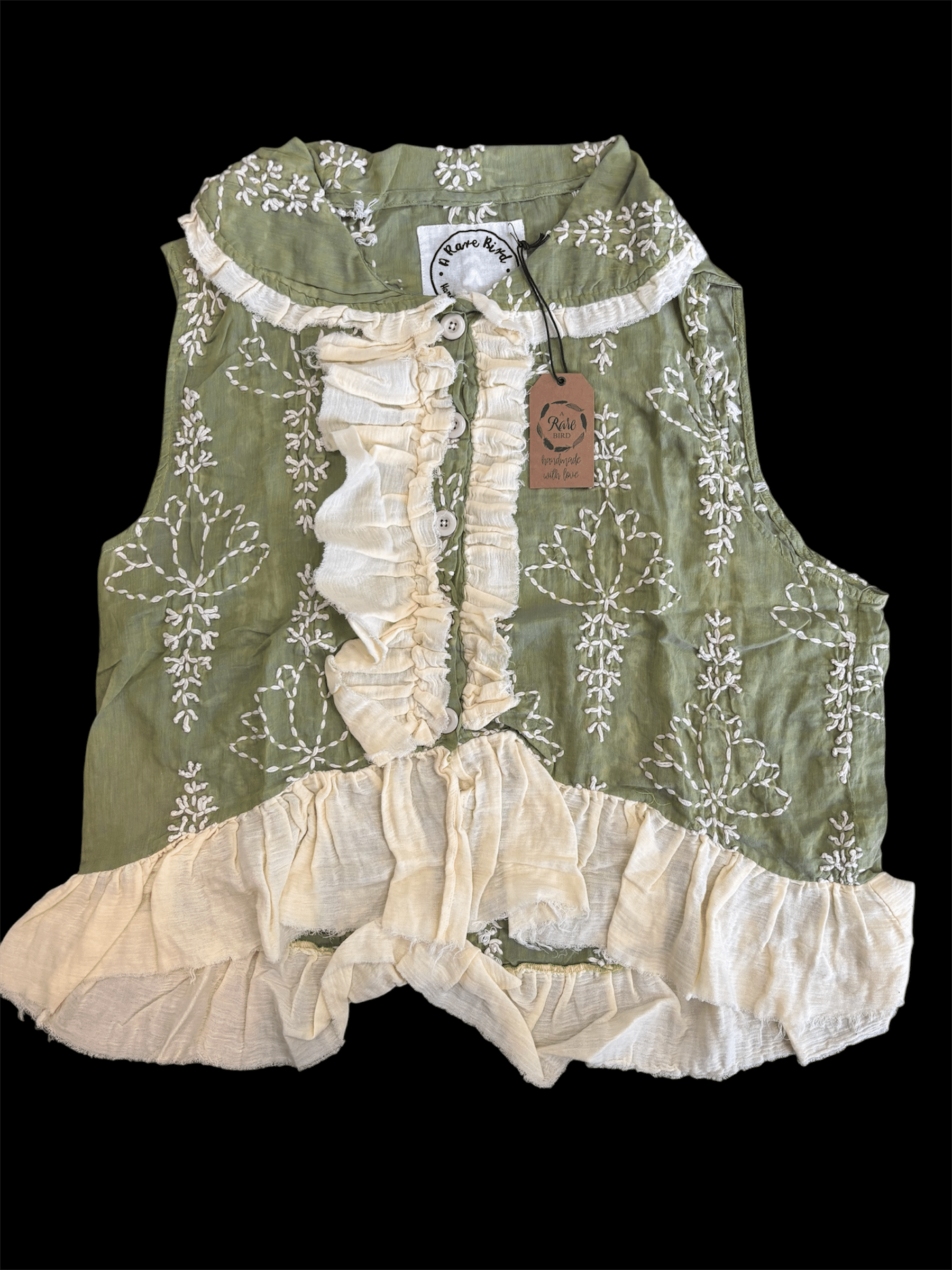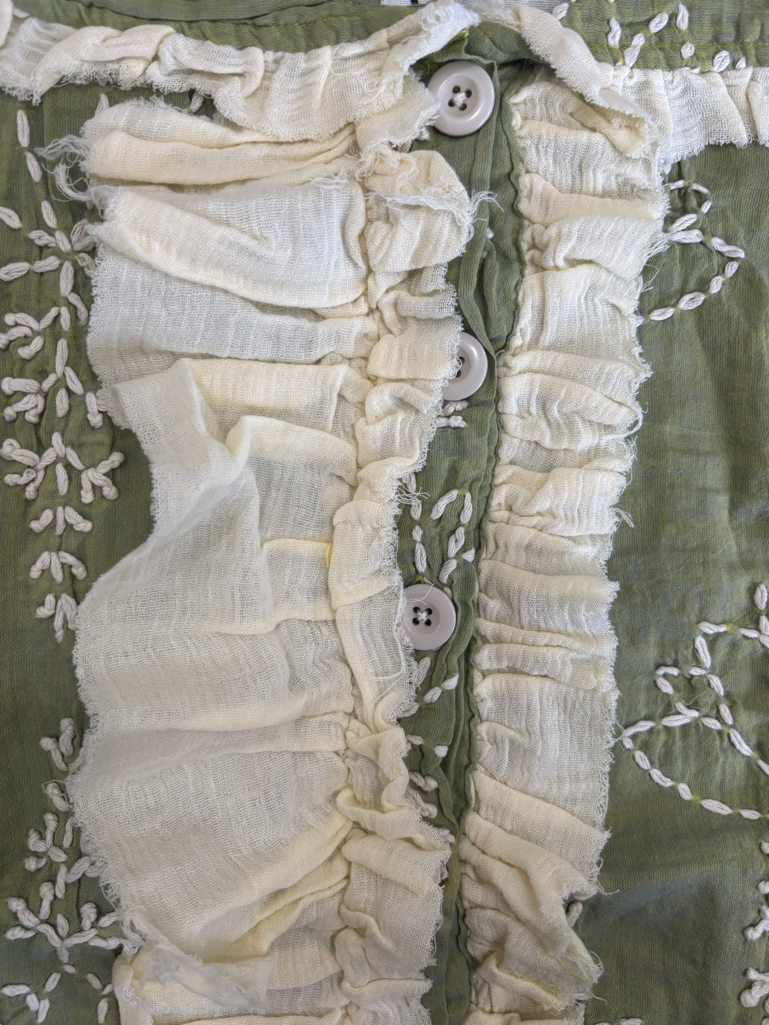 A charming green vest adorned with delicate hand embroidery and soft, vintage off-white ruffles. Light, feminine, and full of texture. It’s the perfect piece for adding a romantic, boho touch to any outfit! Available in S/M & L/XL.
