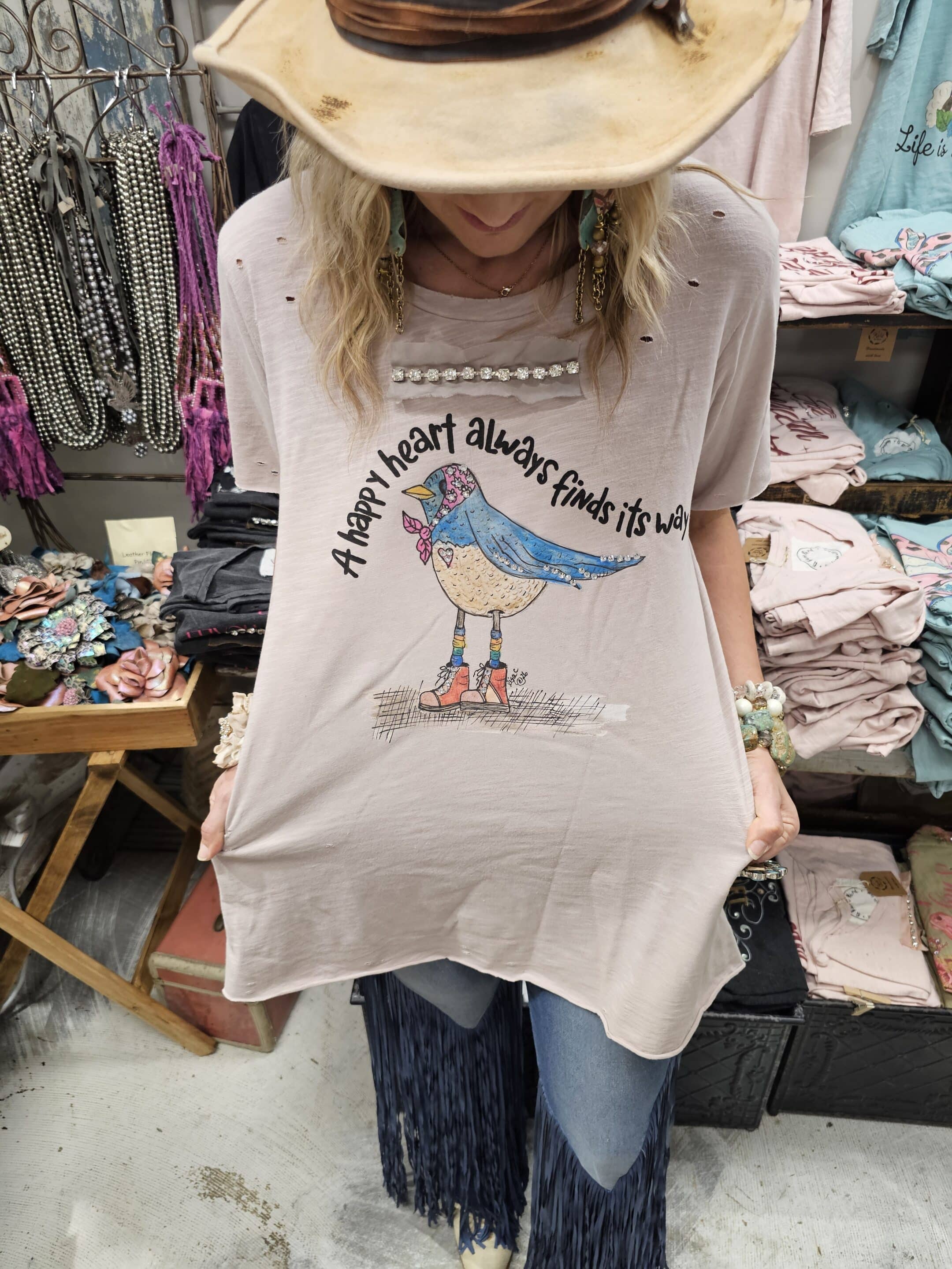 A Happy Heart Always Finds It’s Way! This pretty oversized 3/4 sleeve tee has this perfect rare Bird artwork just showing a happy bird all dressed in unique happy clothes. A perfect way to start your day by wearing this amazing HAPPY shirt! Available sm or lxl