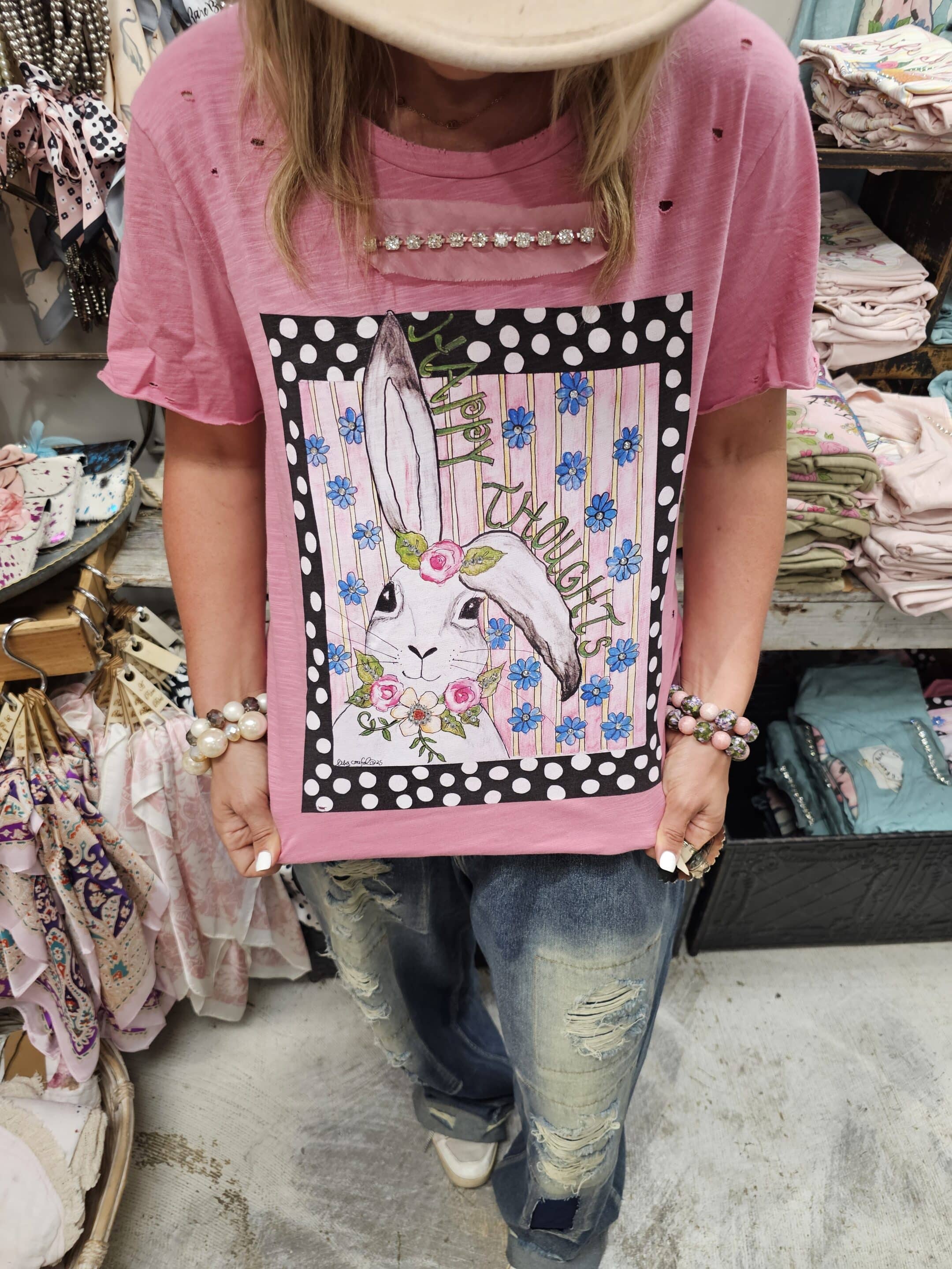 A cute bunny to remind you… happy thoughts only! With sweet stripes, florals, and polka dots on this 100% cotton tattered shirt. Oversized and sparkling with rhinestones, this shirt is available in sm and lxl.