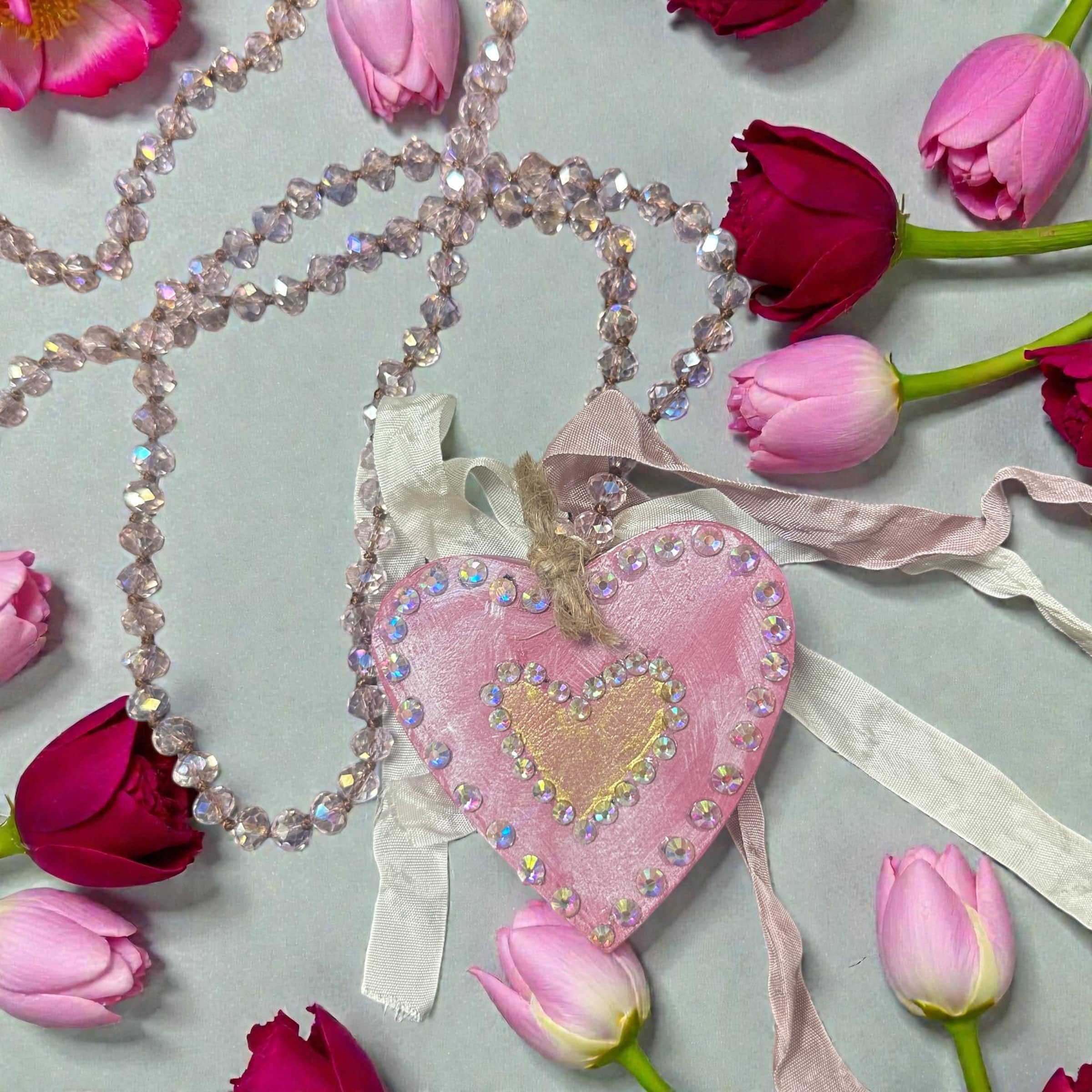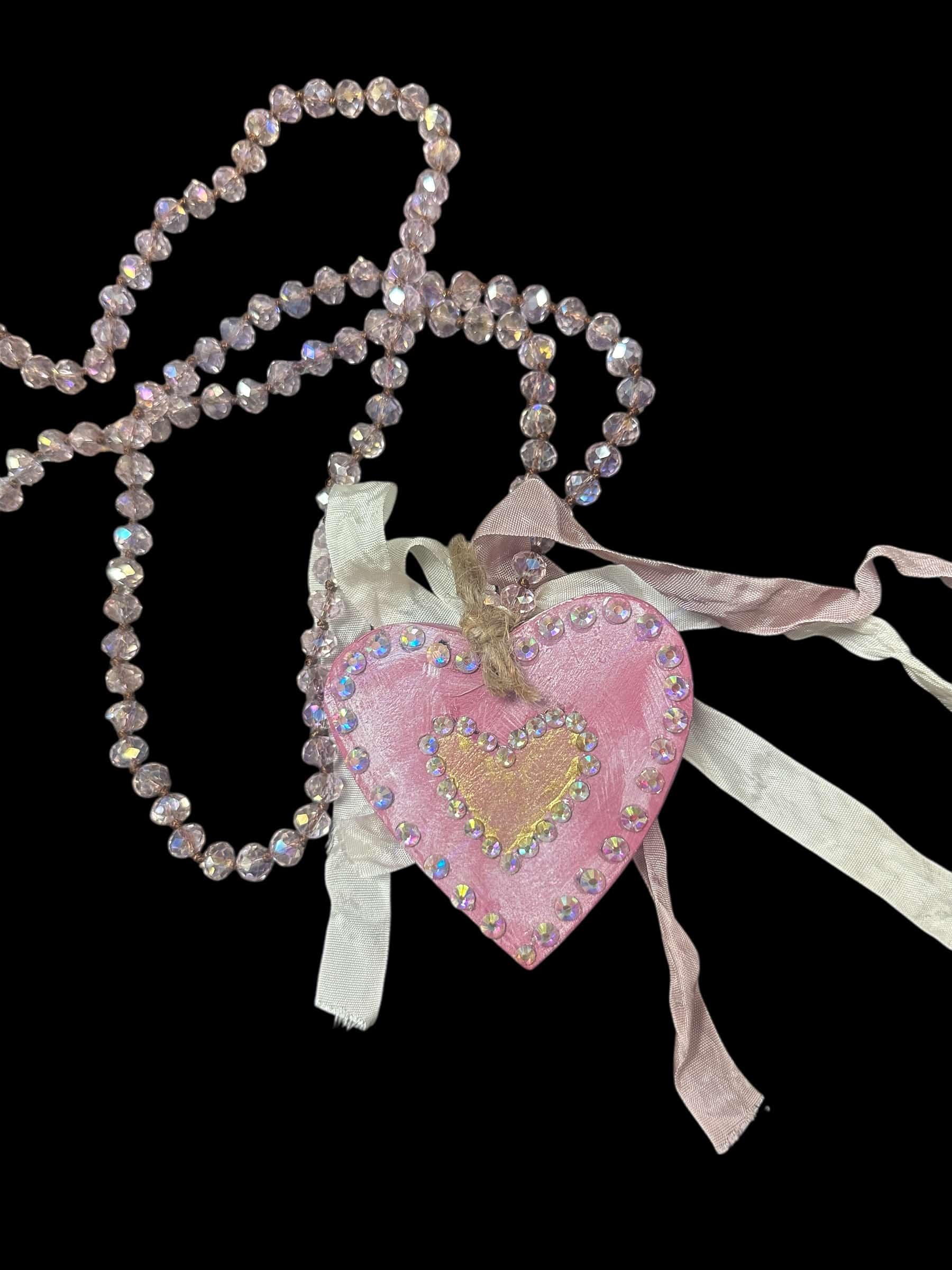 Pretty Pink Wooden Heart is embellished with sparkles and silk satin ribbon. Hand painted and strung on crystal beads can be worn for any occasion.