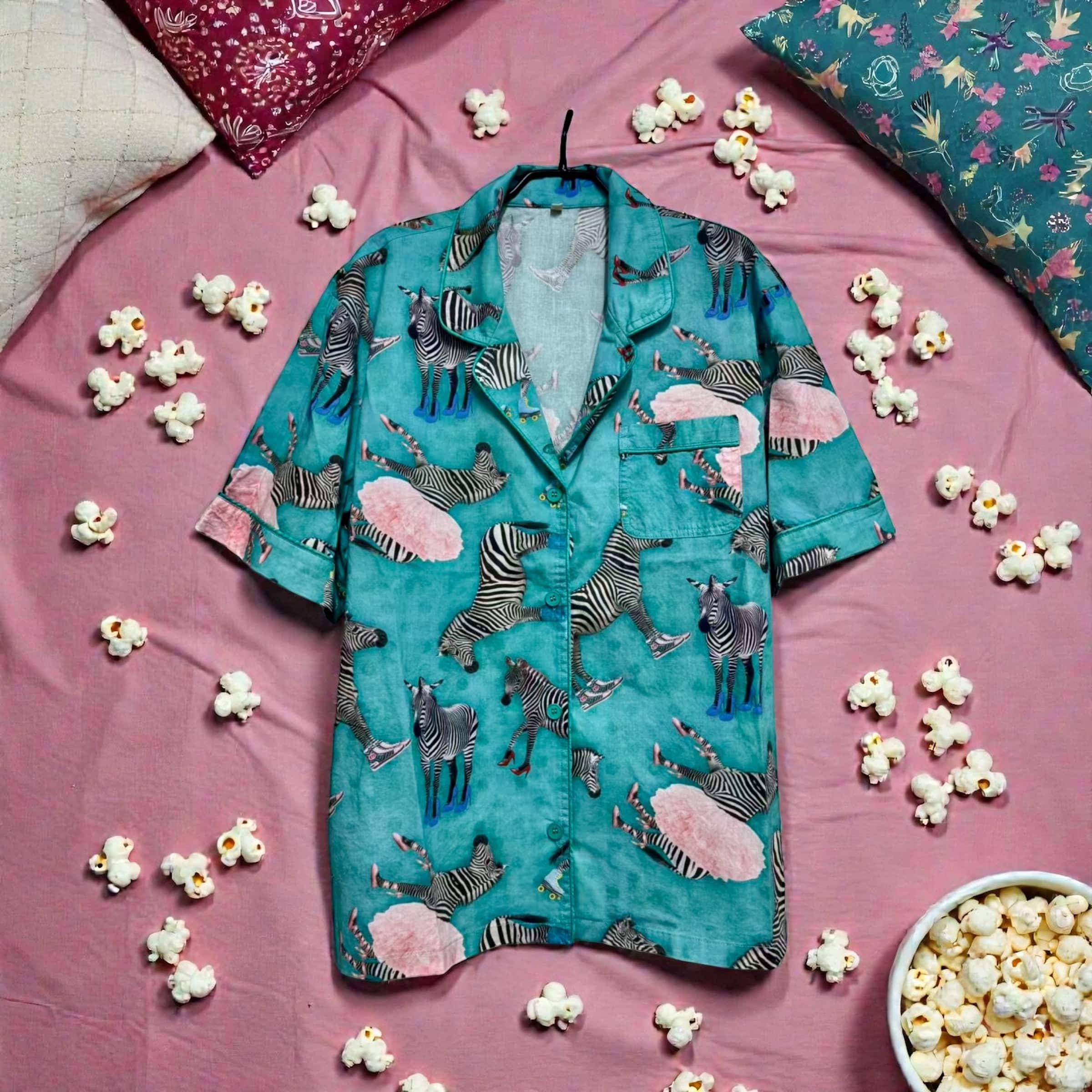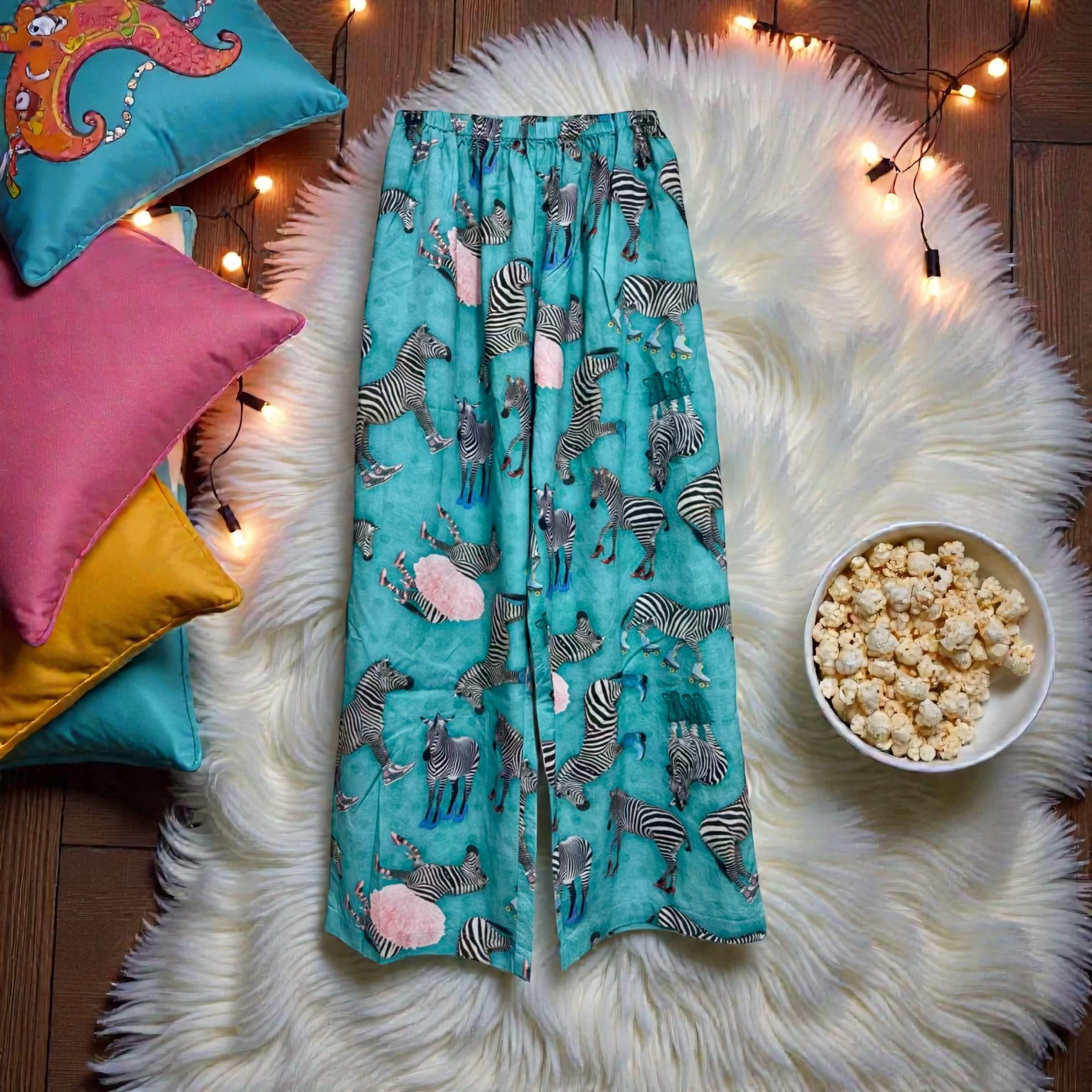 NEW TO A RARE BIRD! These adorable 100% polished cotton pajamas are an adorable new adventure! The turquoise background is covered in zebras sporting all the shoes! Ballerinas..galoshes..roller skates…high heels or western boots…even tennis shoes! We through in a tut for the ballerina too! Available in sm(o-8) or lxl (10-2x) Nice elastic waistband with drawstring. SO VERY FUN! Comes as a set.