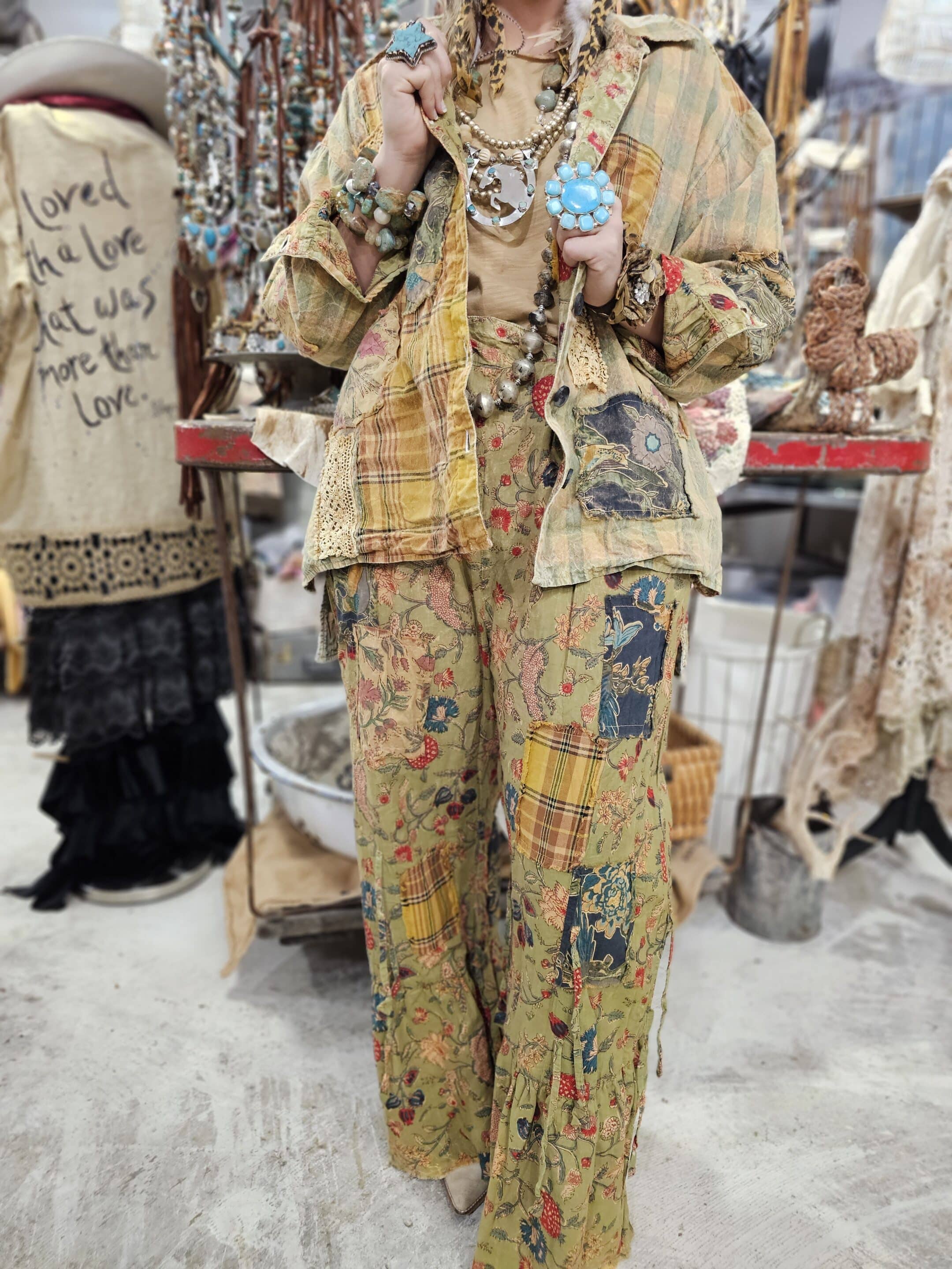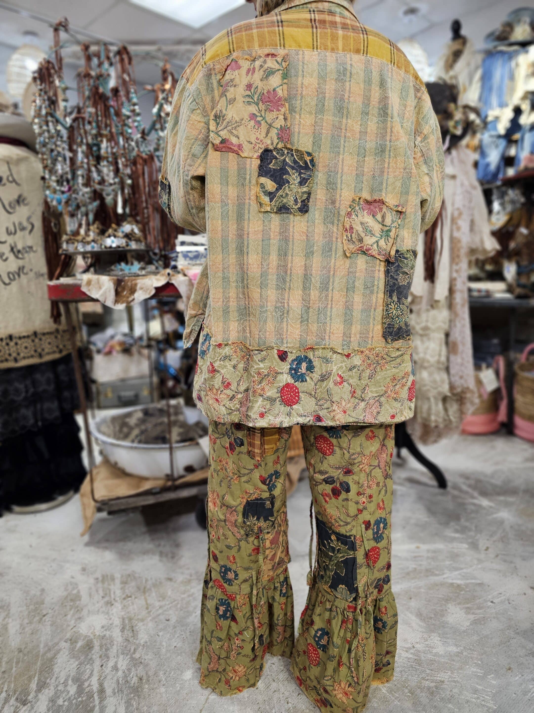 Our adorable Reversible Strawberry Jacket features a sweet vintage strawberry print on one side, and an eclectic mix of plaid, crochet, and floral patches and prints on the other. Hand stitched, vintage, and unique! One Size fits 2-2X.