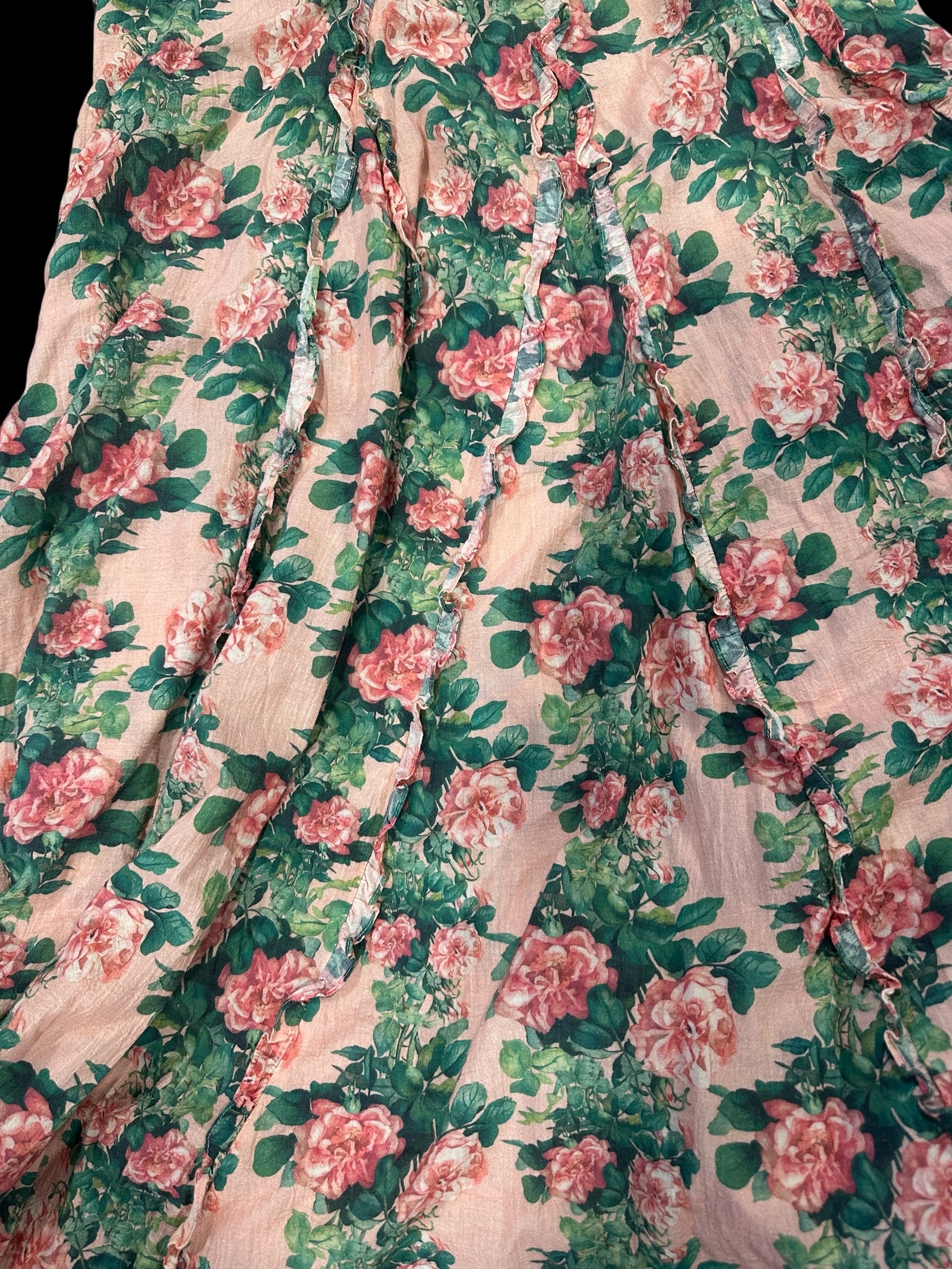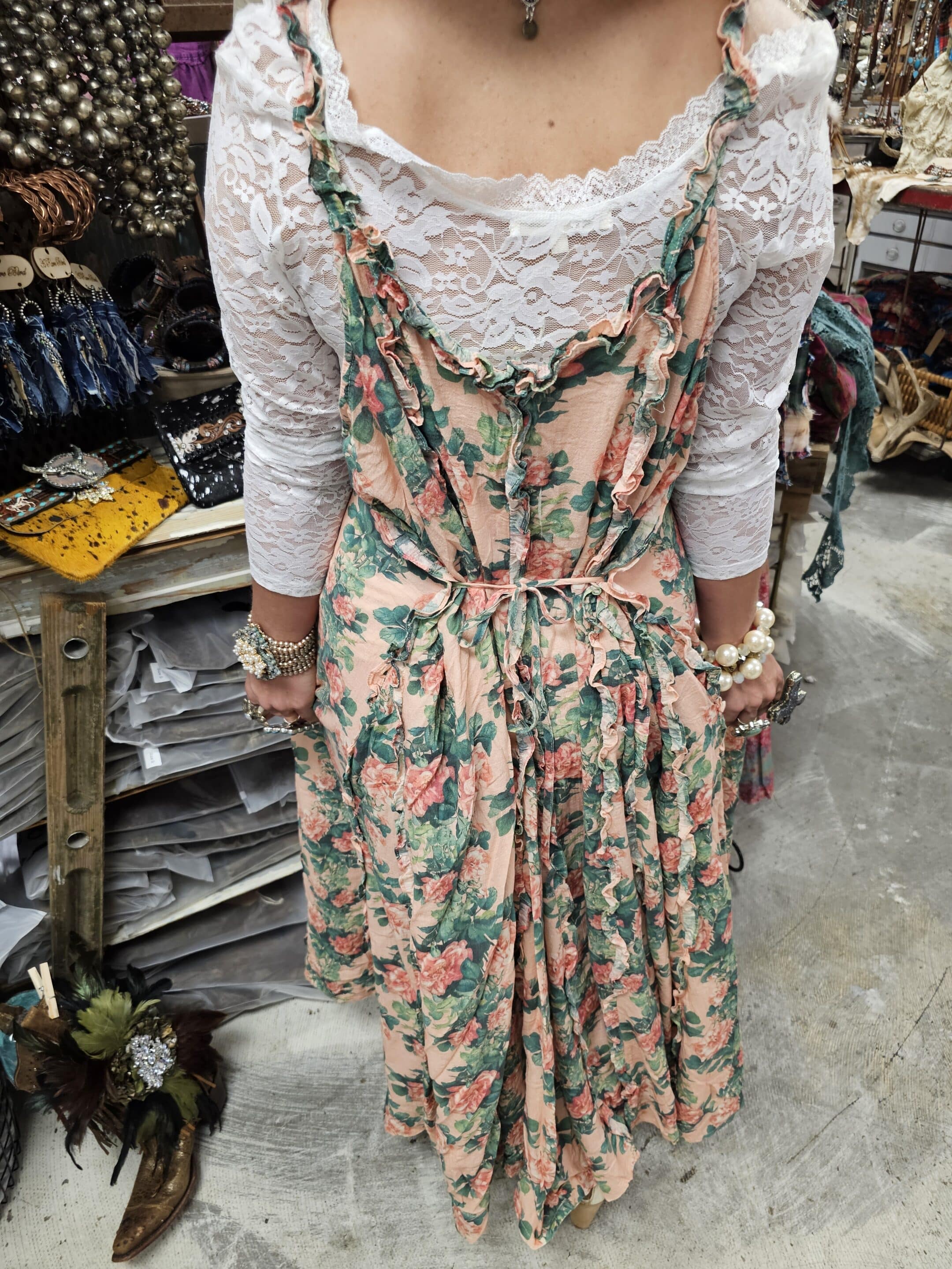 Soft and flowy, this dress has many panels stitched together leaving a small ruffle on each one extended to the floor. This creates a beautiful swing at the bottom. Has a tie to cinch in back if necessary. One size can be worn sleeveless or with our pretty lace mesh shirts.
