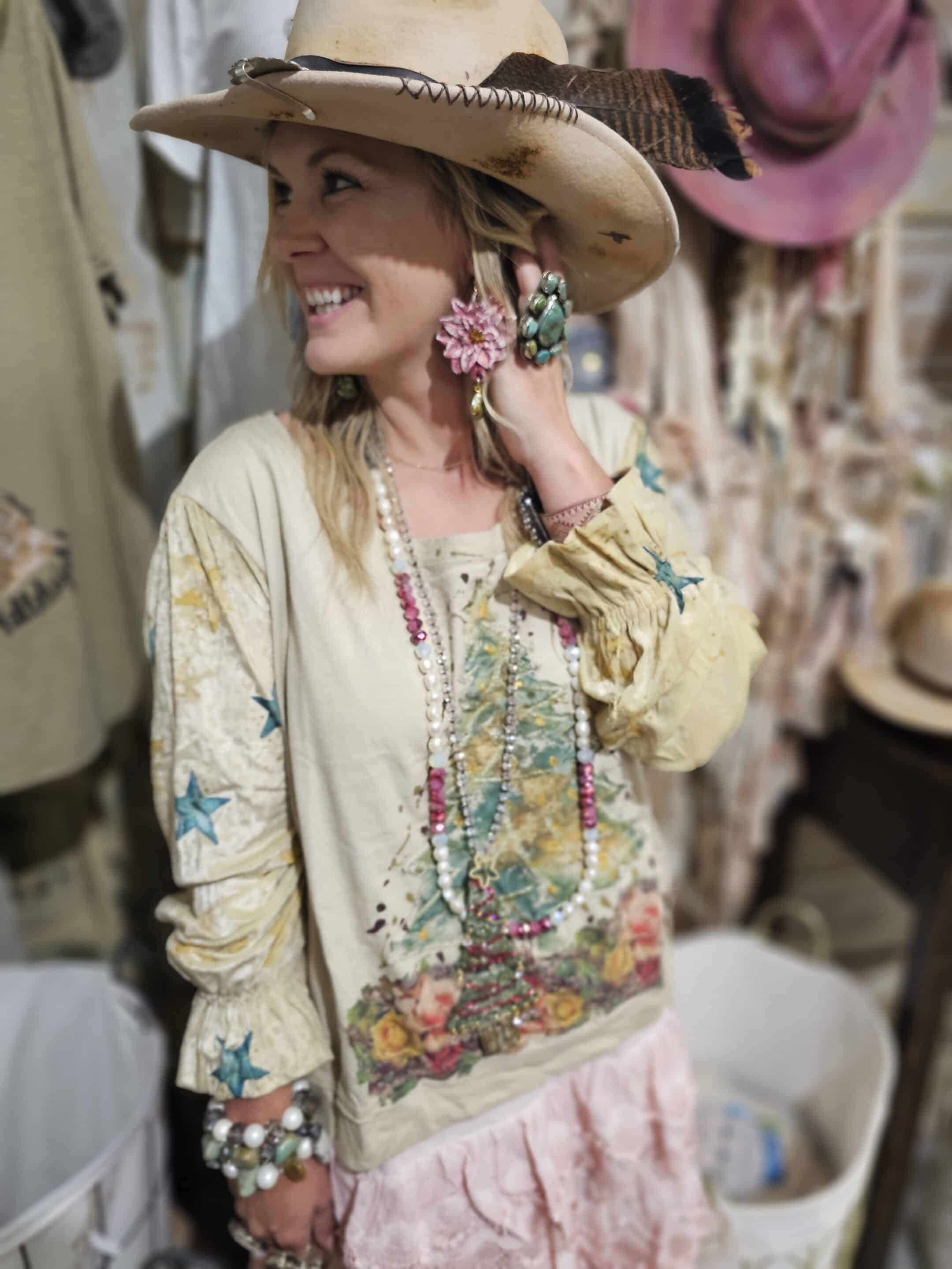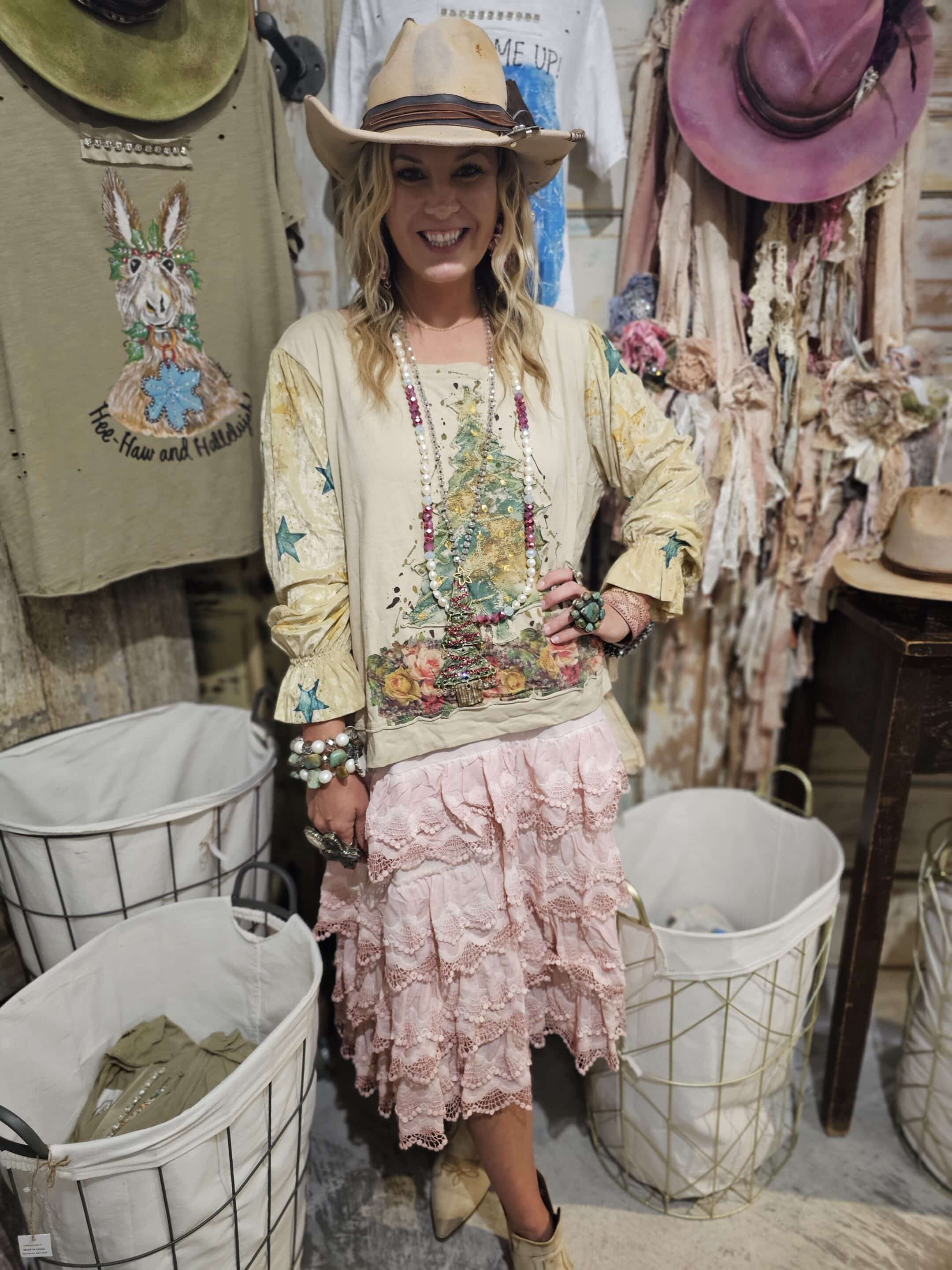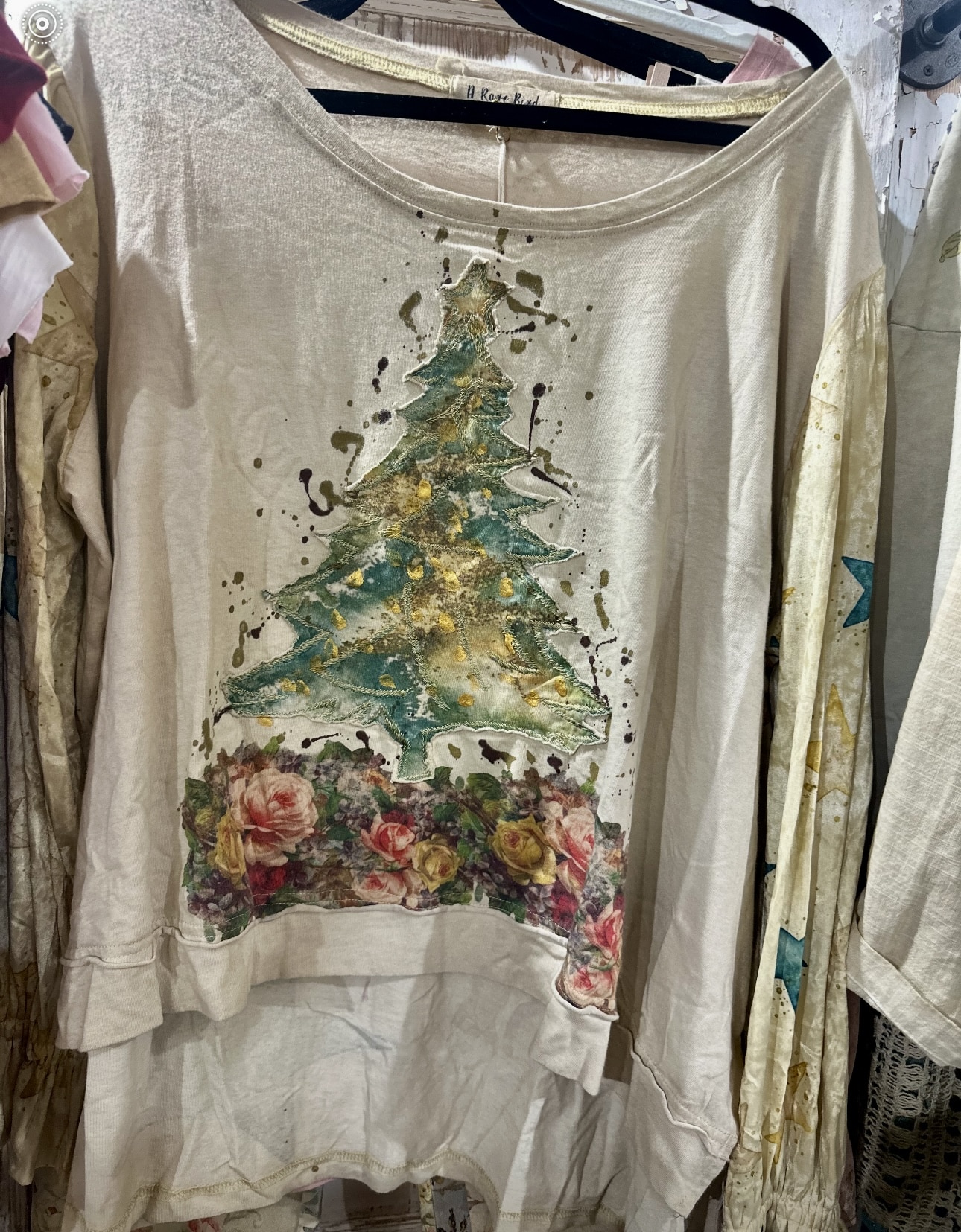 Always the first to sell out, this rare Bird favorite is crafted from vintage cotton in a flattering high low body style. A beautifully printed and hand stitched Rare Bird Christmas tree garden design makes it truly one of a kind. the burnout velvet sleeves add an elegant touch of texture and shine, giving it that festive finish It pairs perfectly with our pink or vintage slip dress and looks stunning with our black velvet ruffle leggings. A magical holiday piece that you’ll reach for year after year.