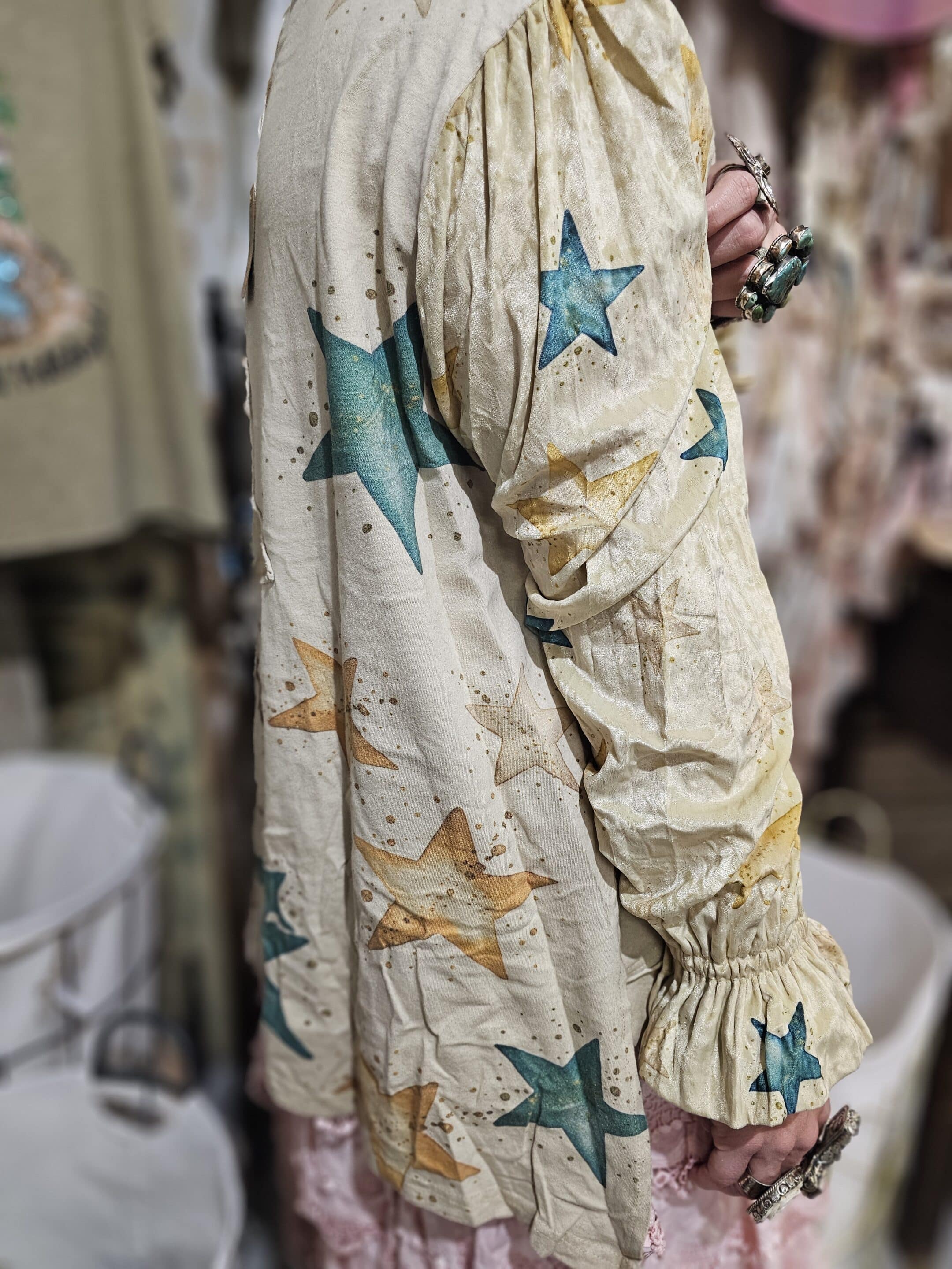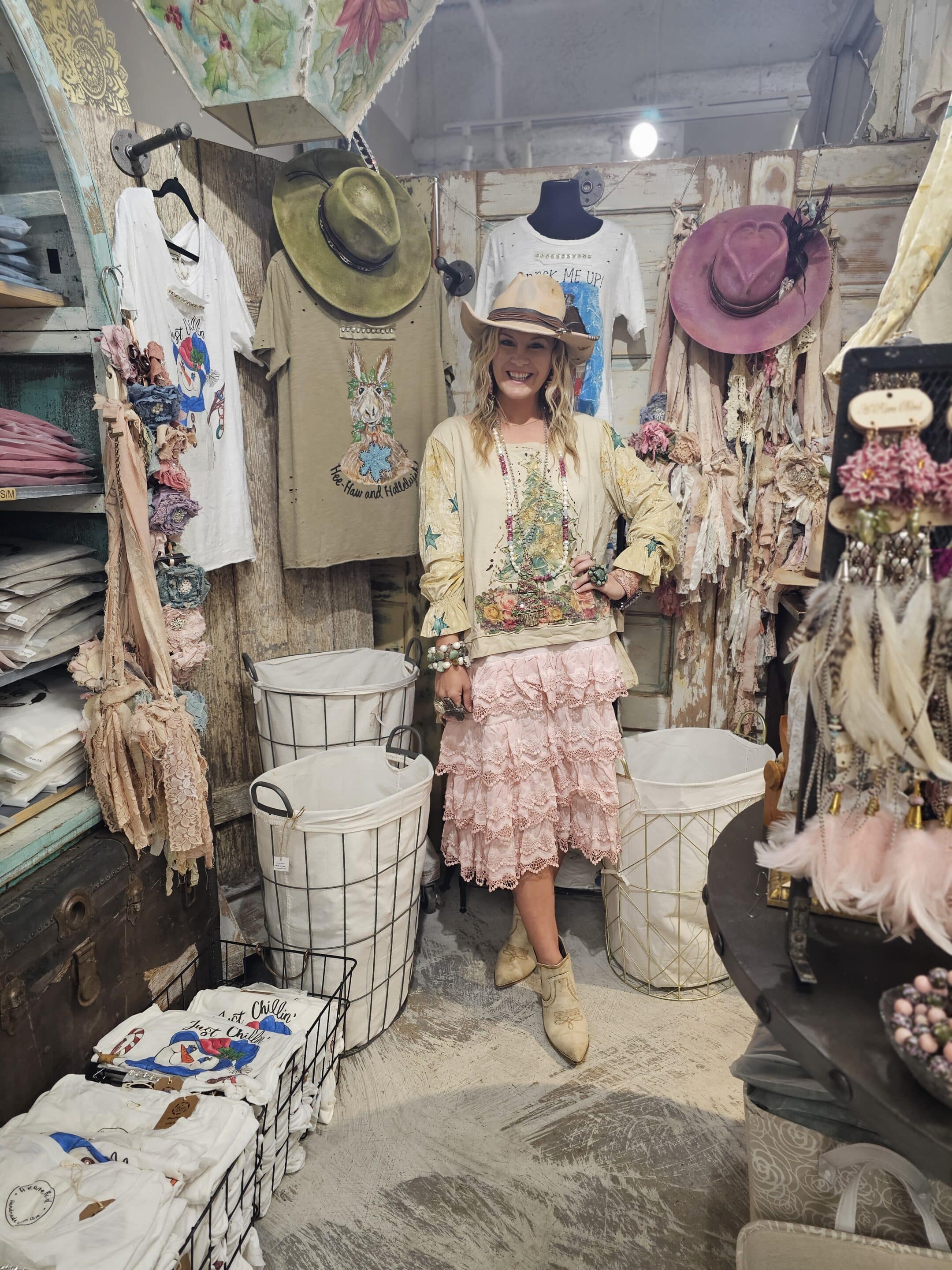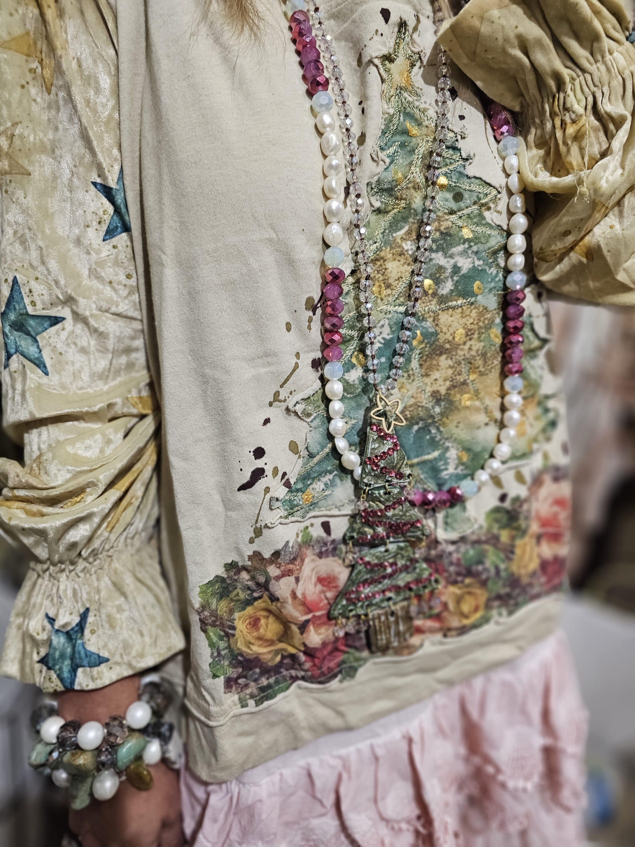 Always the first to sell out, this rare Bird favorite is crafted from vintage cotton in a flattering high low body style. A beautifully printed and hand stitched Rare Bird Christmas tree garden design makes it truly one of a kind. the burnout velvet sleeves add an elegant touch of texture and shine, giving it that festive finish It pairs perfectly with our pink or vintage slip dress and looks stunning with our black velvet ruffle leggings. A magical holiday piece that you’ll reach for year after year.