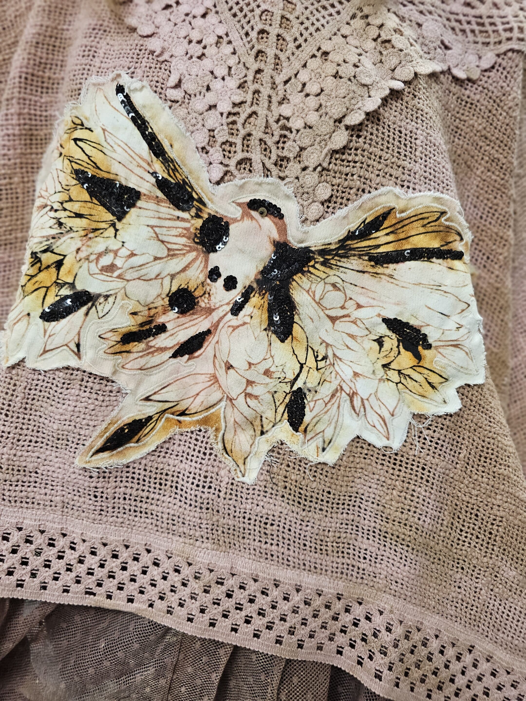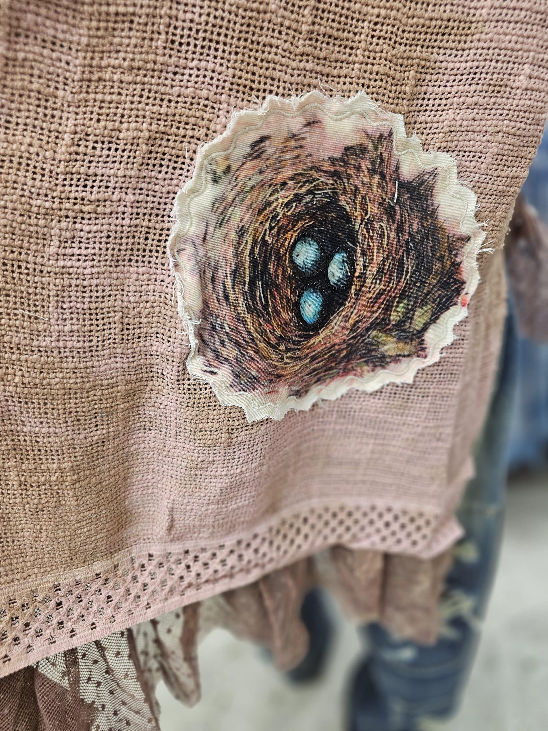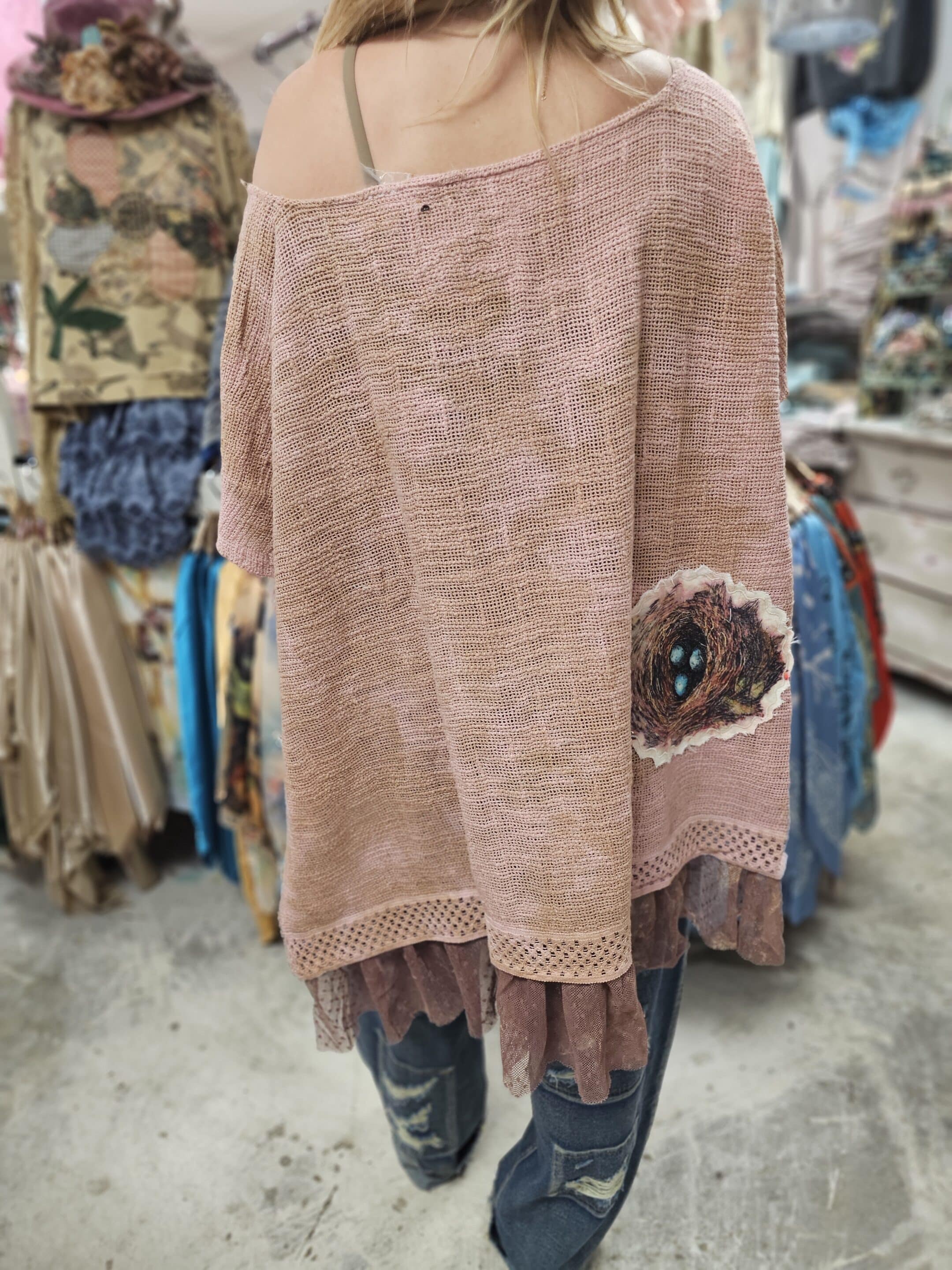 A soft, whimsical piece featuring delicate lace accents and a beautifully detailed songbird patch, with a matching nest patch for an extra touch of charm. Light, romantic, and effortlessly boho. 95% Cotton and 5% Nylon makes for a soft breathable fabric. Lined with pretty vintage polka dot lace. One Size fits 2-2X.