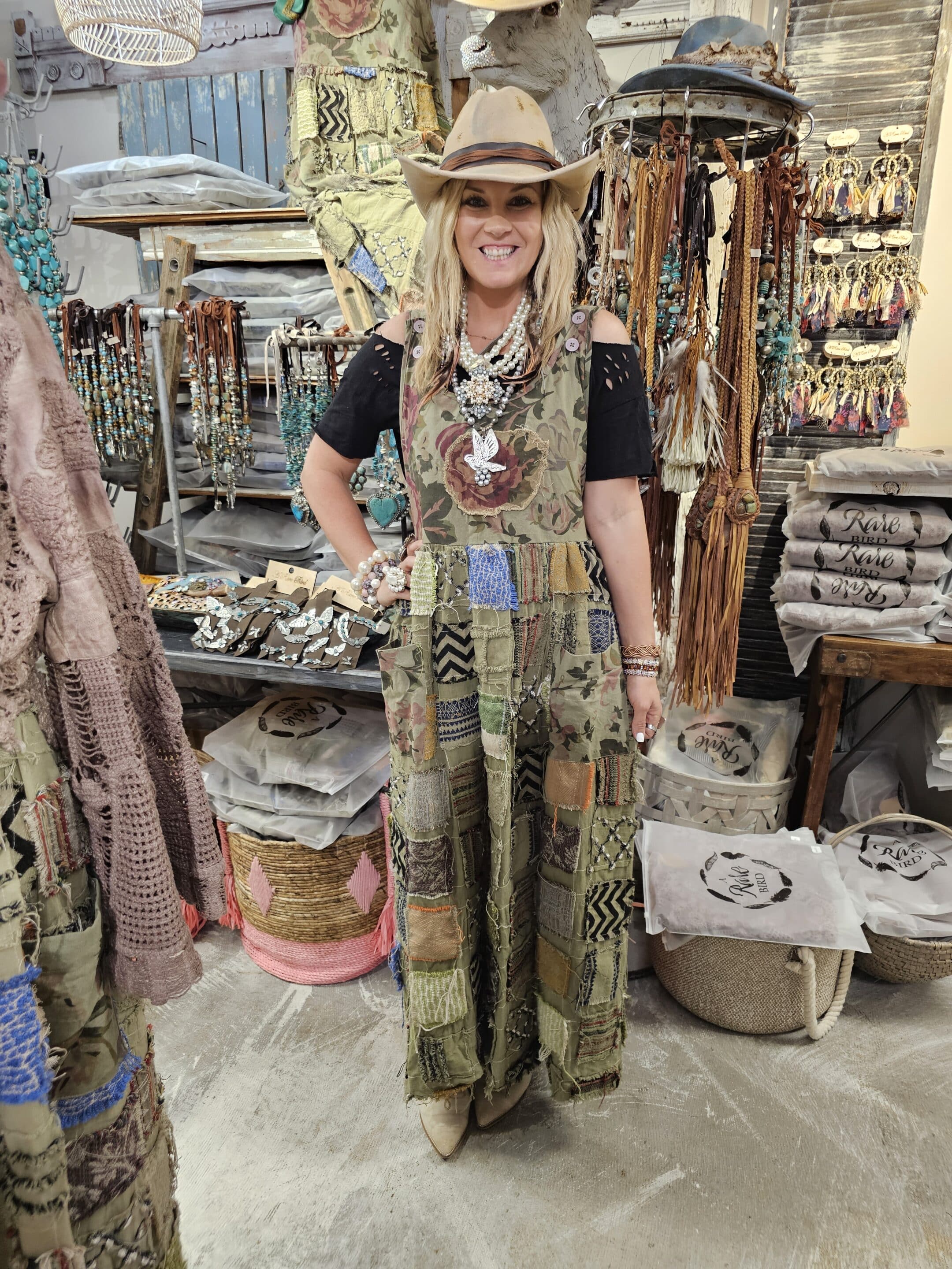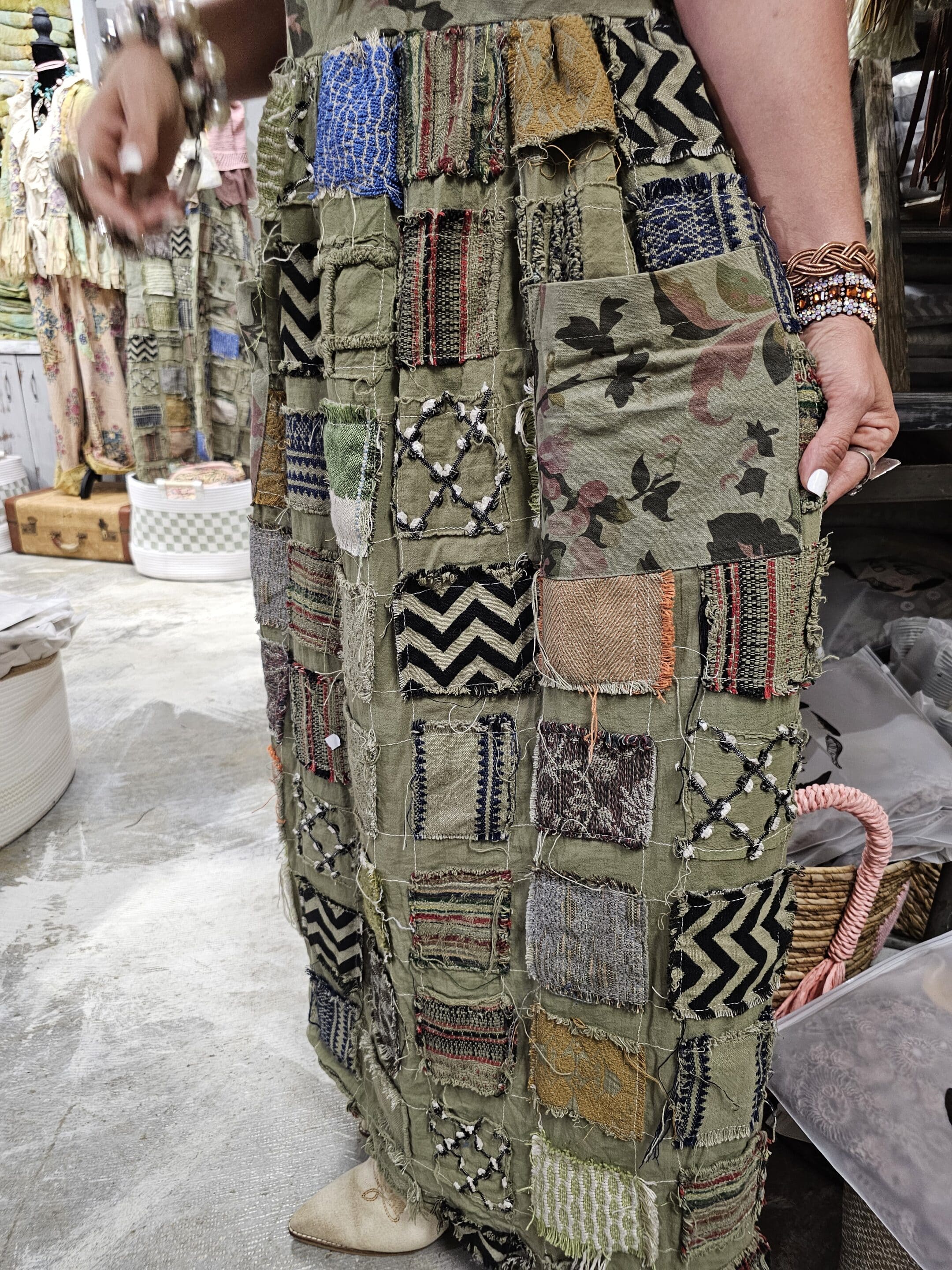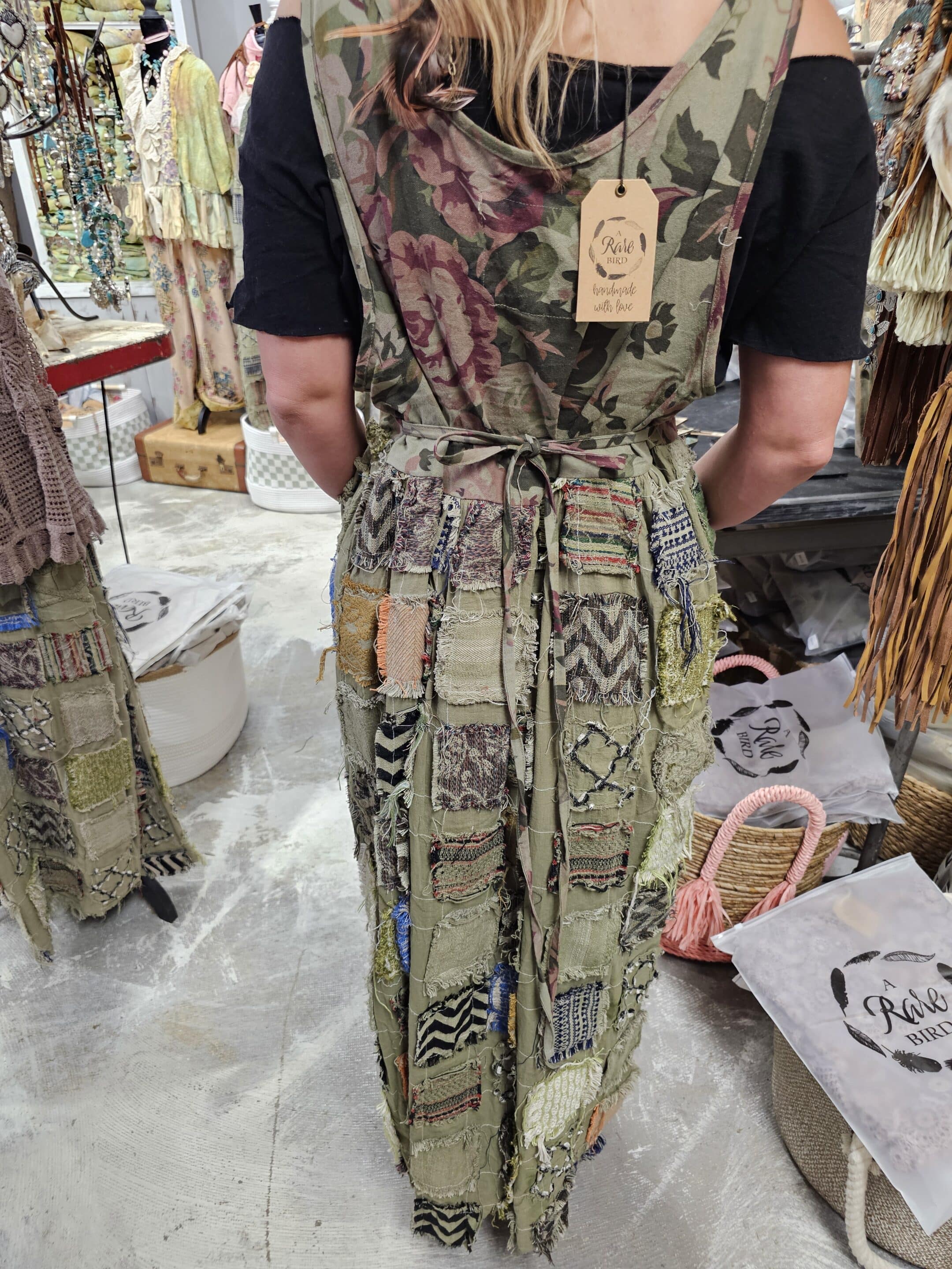 Truly a beautifully unique dress! Neutral olive green with a floral print. Decorated with hand stitched “book” patches. This Storybook Dress is for those who love to express their true character! One Size with side ties to cinch at the waist if desired for a cinched look.