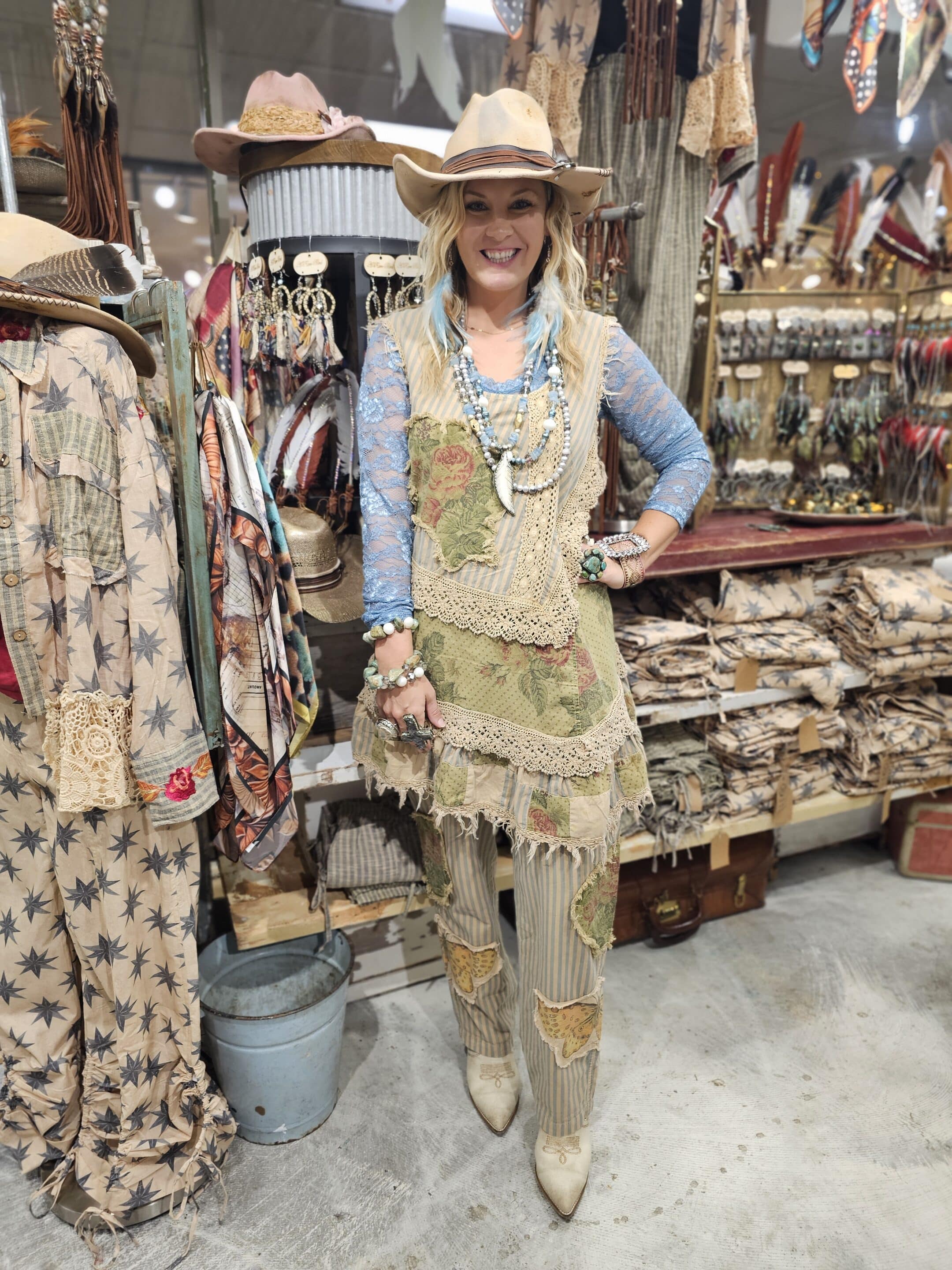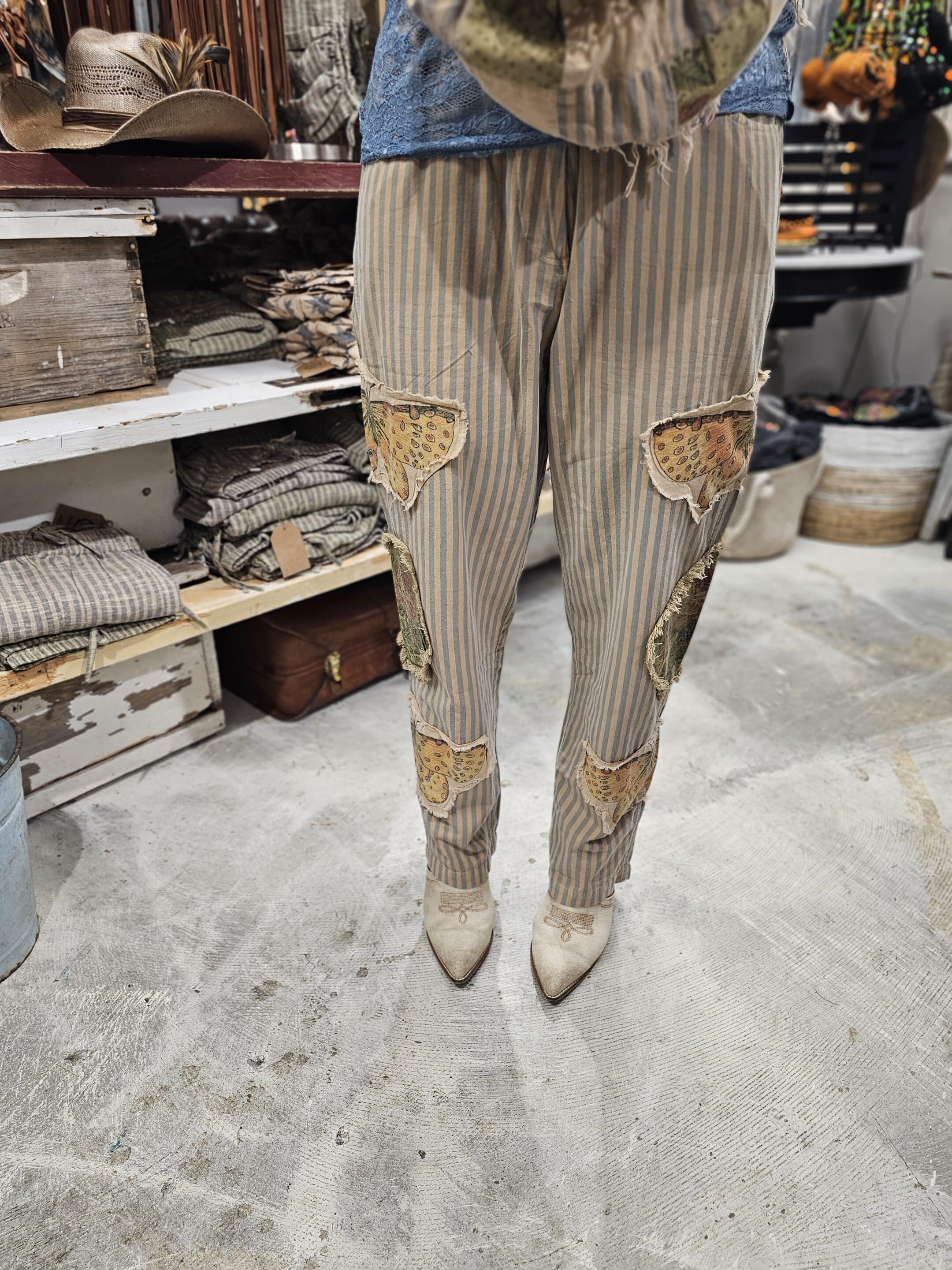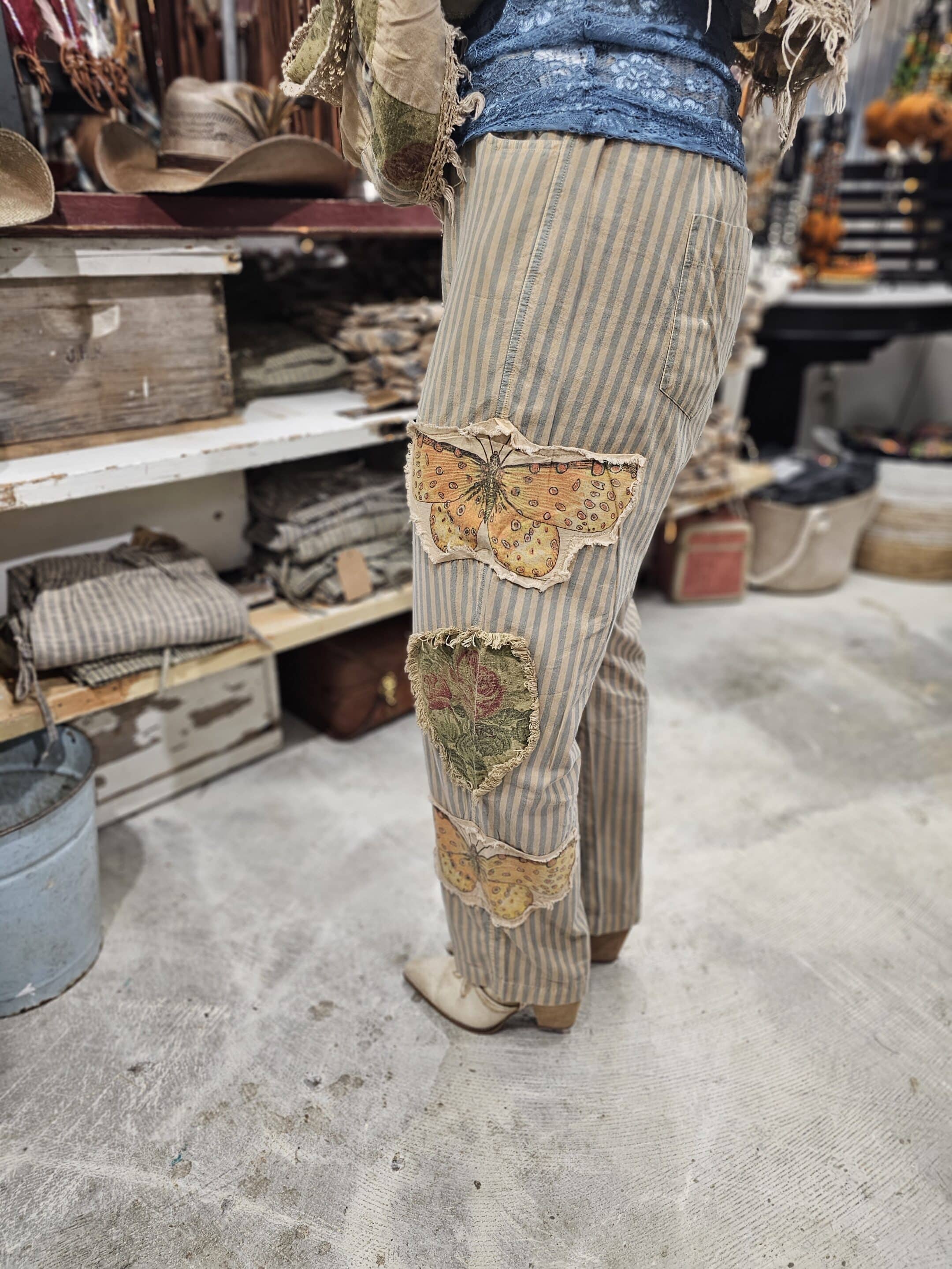 Comfy and gorgeous stripe cotton pant with butterfly patches matches the butterfly shirt dress and many more items in Rare Bird group. s,ml,xl The pants are darling with flat front and elastic in the back. And yes…as always pockets! Matches with the pretty butterfly shirt dress and the lovely Robin sleeveless shirt.