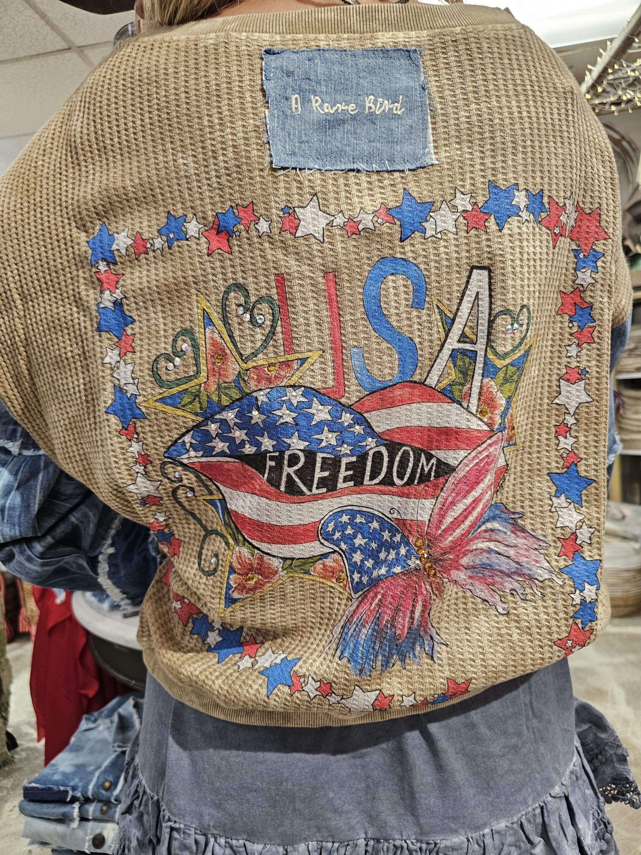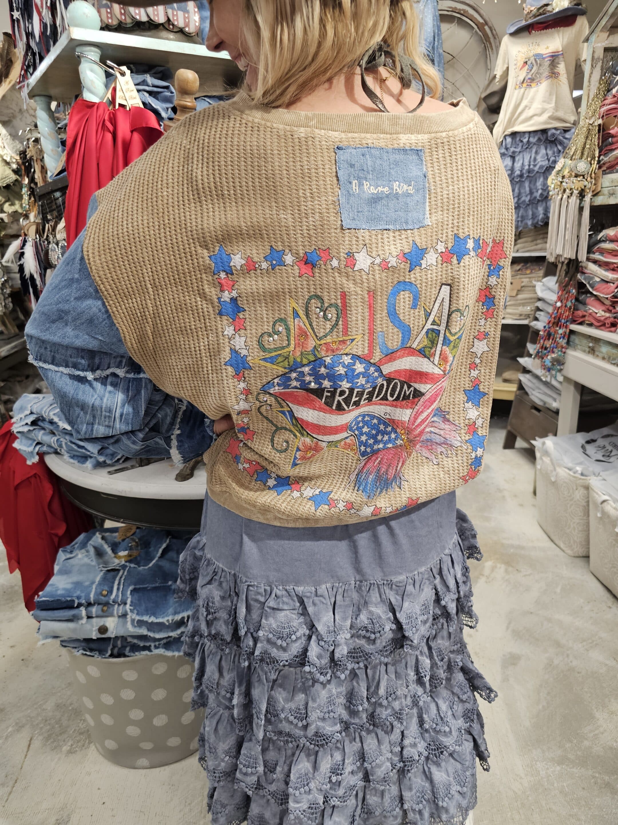 The USA Freedom Waffle Jacket is your new go-to for cozy cool denim vibes! With soft waffle fabric, playful denim sleeves, and a nifty drawstring to cinch just right, this relaxed fit button-up keeps you comfy and stylish. Perfect for throwing on when you want to look effortlessly fun and laid-back. Lisa’s celebratory design on the back!