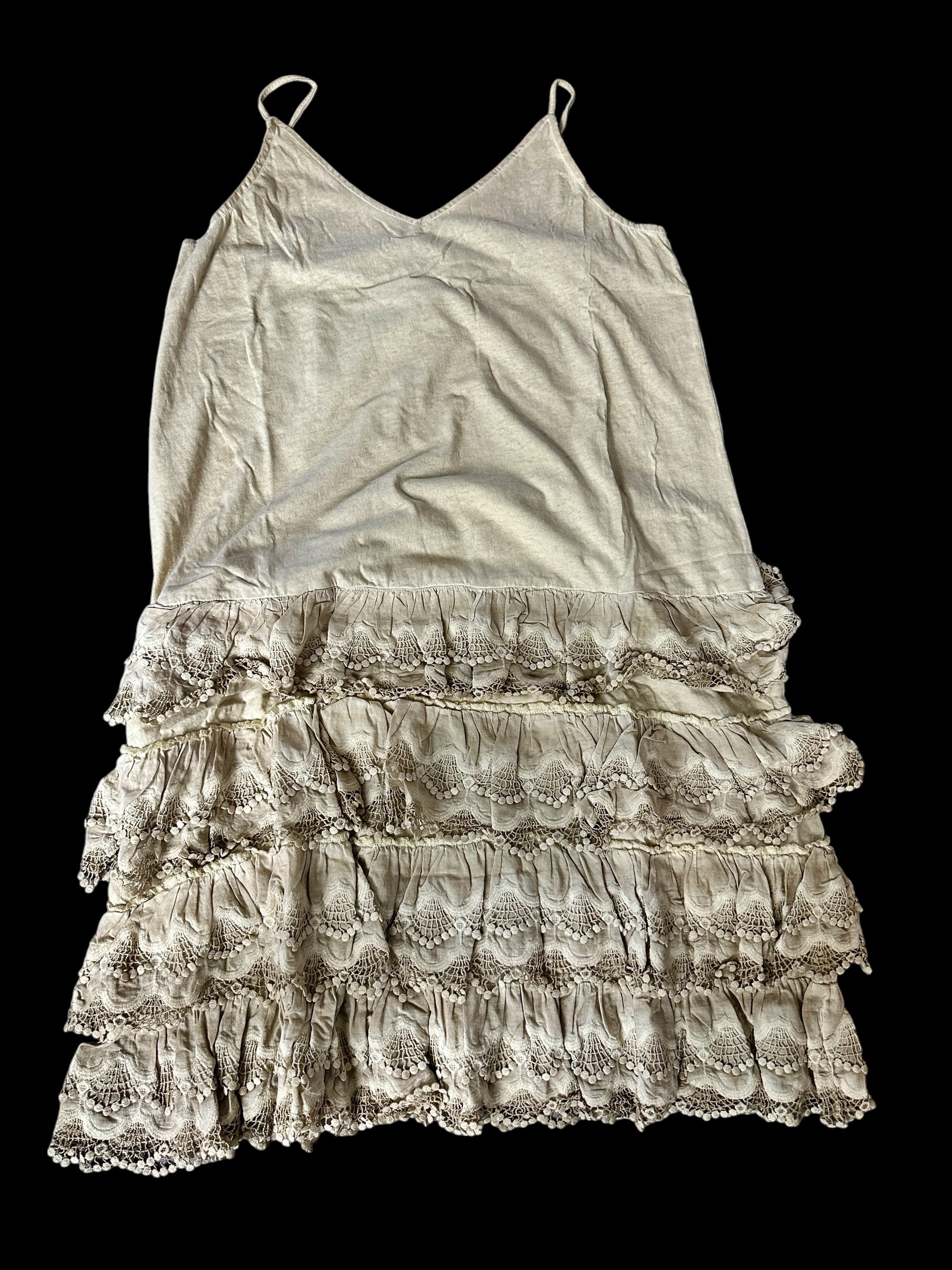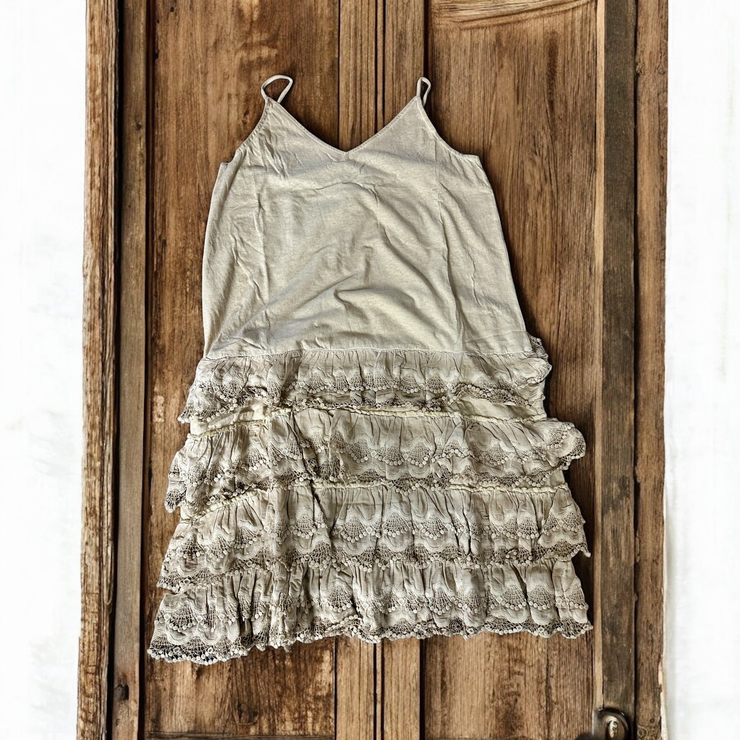 This gorgeous slip dress is a RARE BIRD essential. Made from soft distressed cotton, it has a lived in comfy feel. It is finished with layers of ruffles trimmed with vintage lace and dyed to perfection. Designed to be worn as a dress or your favorite layered piece, the adjustable straps make this a favorite for sure. Available sm and lxl and 3 colors.