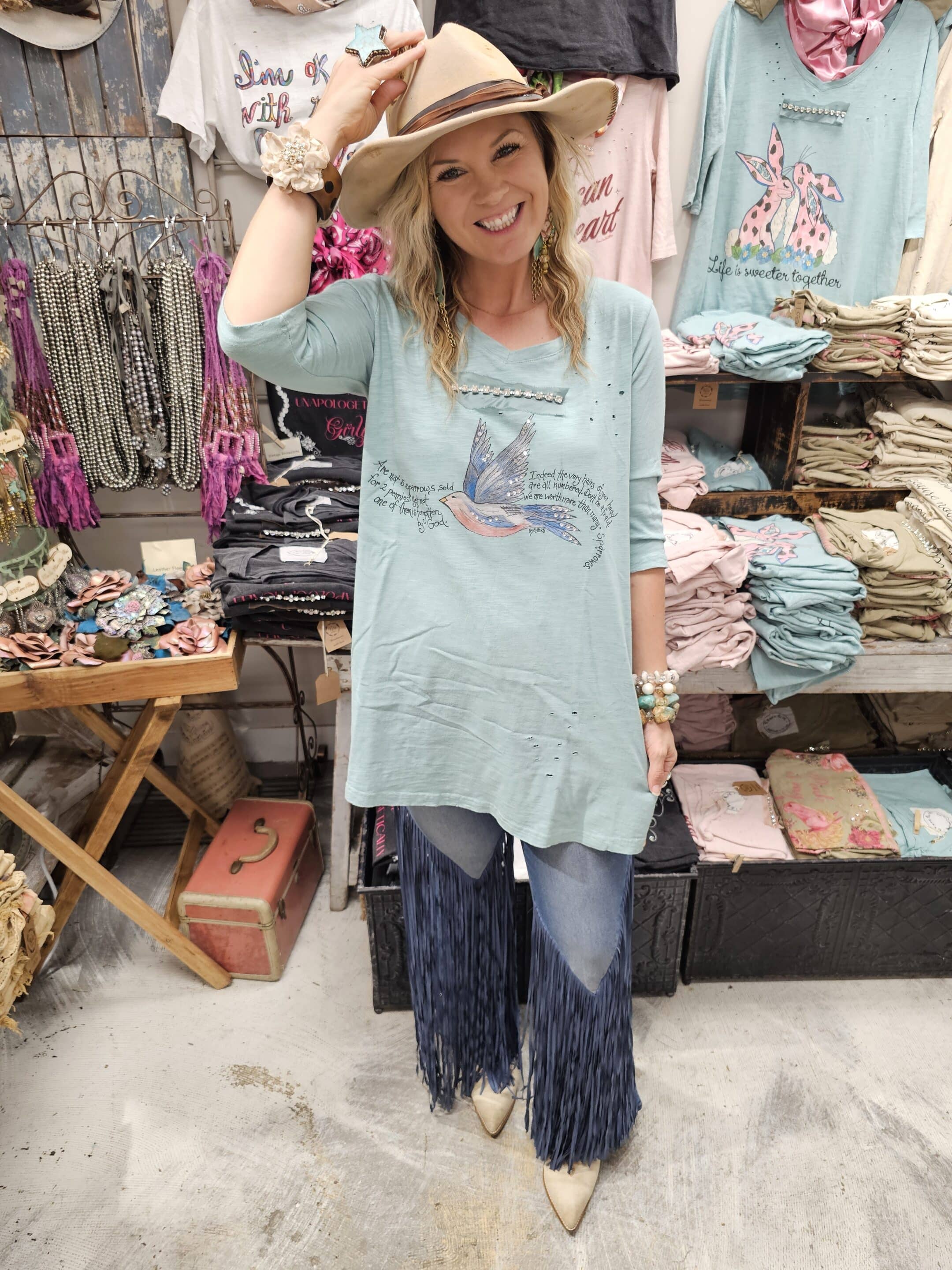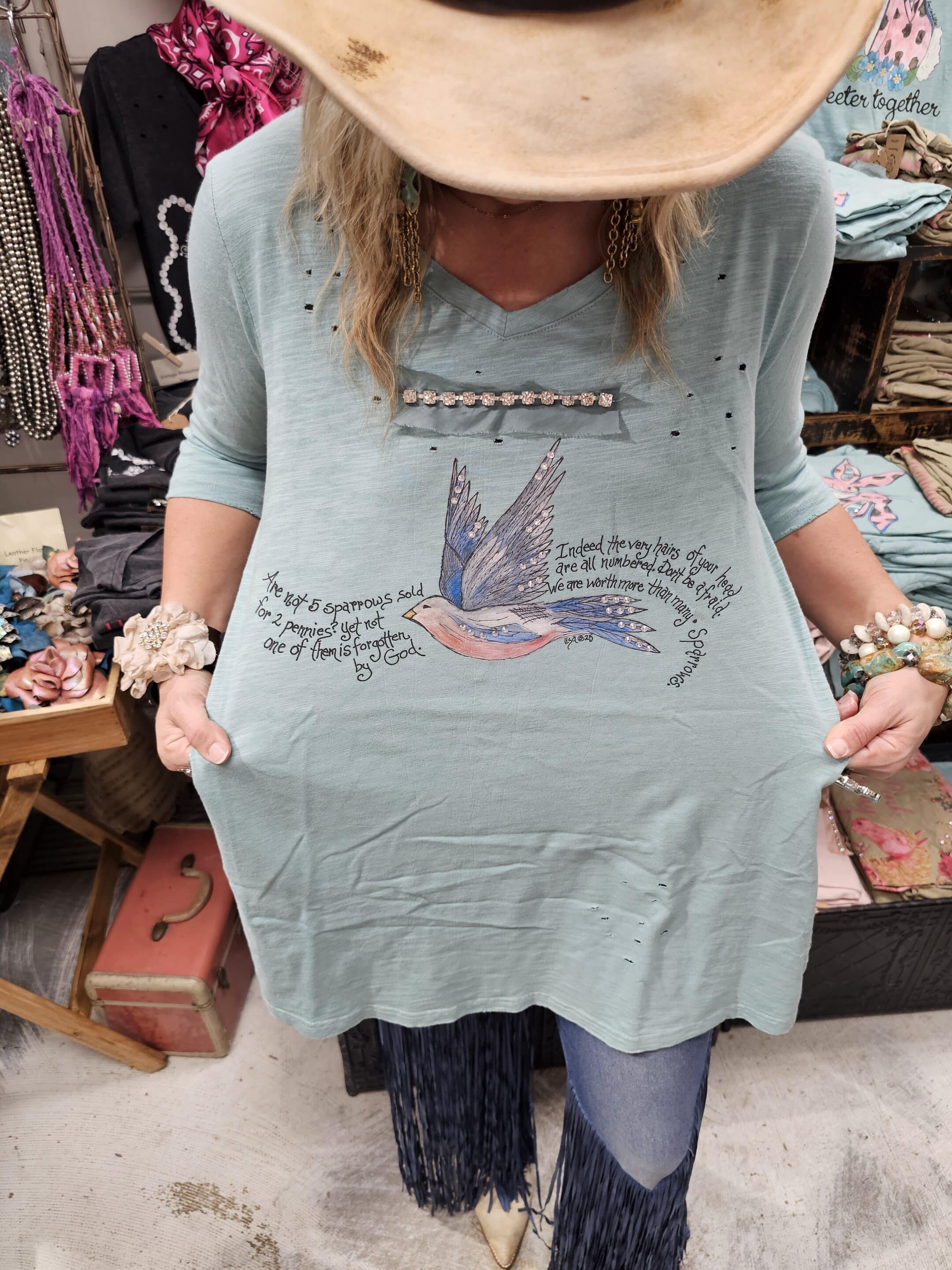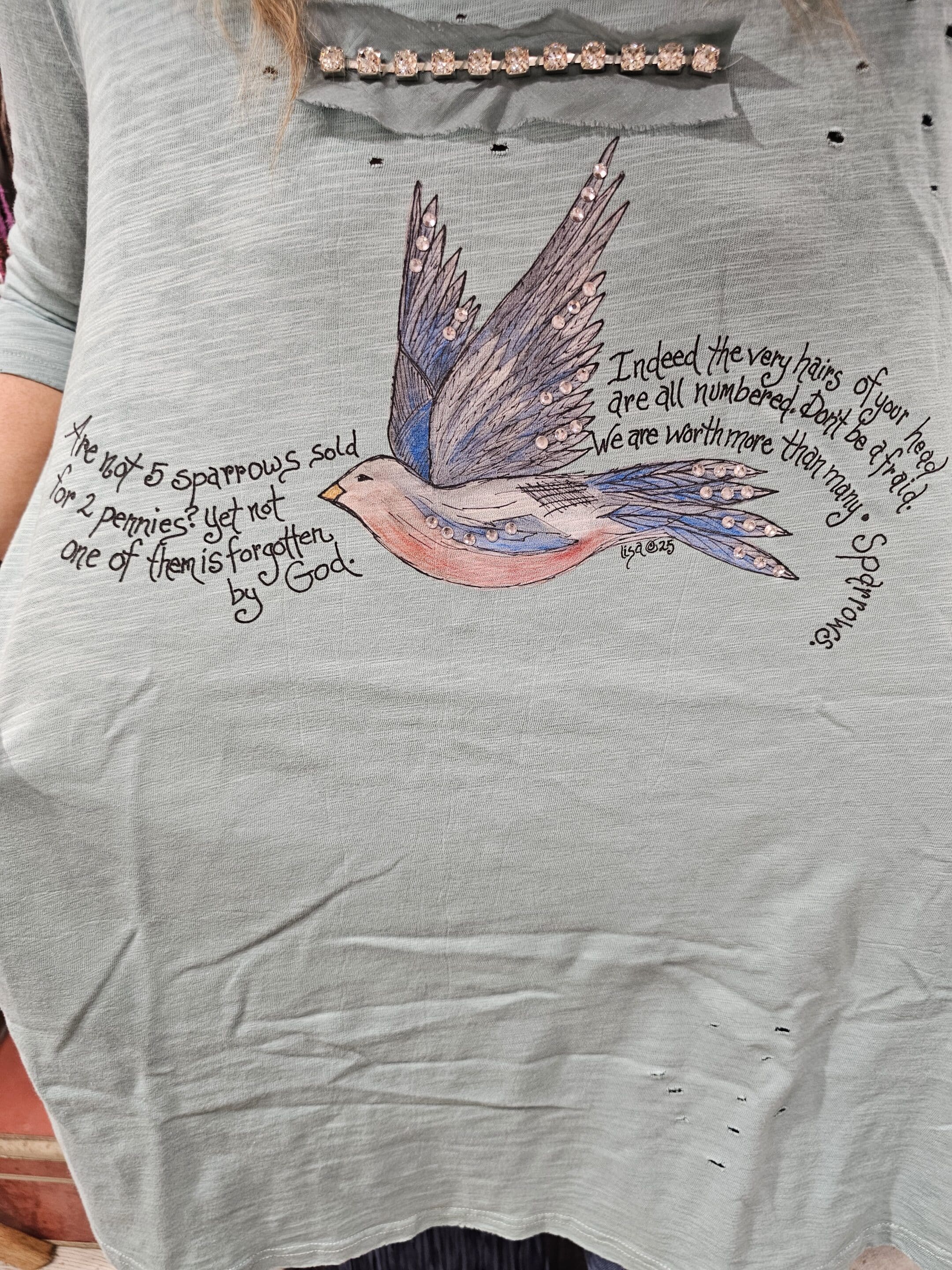 What a beautiful scripture! This reminds us that if the Lord takes care of the small sparrows of the fields He surely will take care of us! Original artwork is Rare Bird. Available sm and lxl…oversized and wonderful 3/4 sleeve.