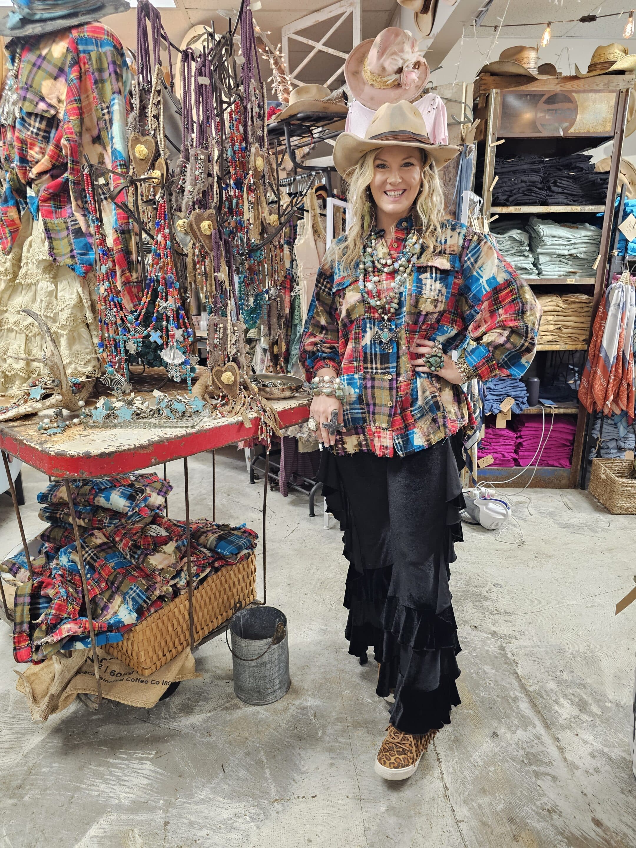 Flannel with a story! Rich shades of red are pieced together like a handmade quilt, each piece stitched together with a bold zig zag stitch. Intentionally mismatched, every section creates a striking patchwork design that feels vintage, lived in, and full of soul.